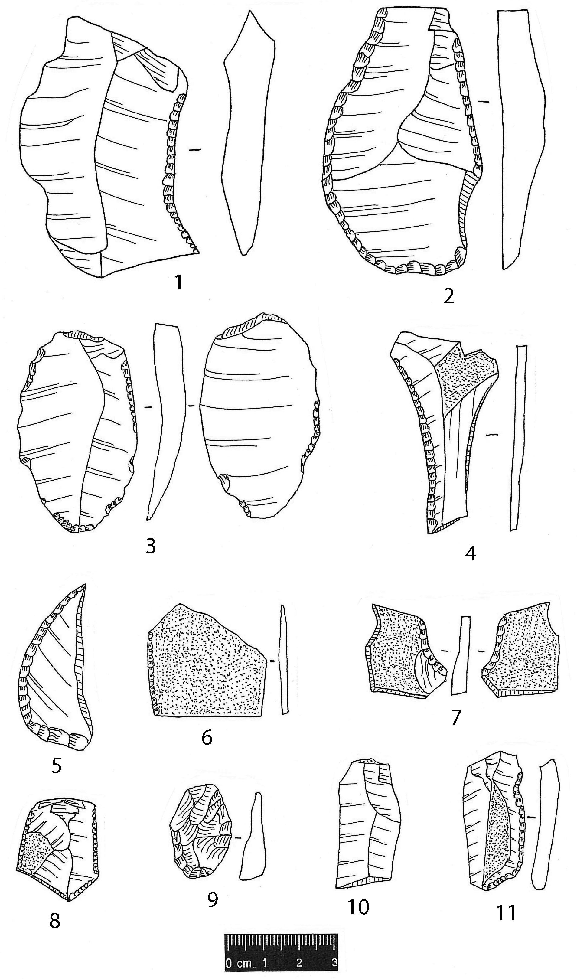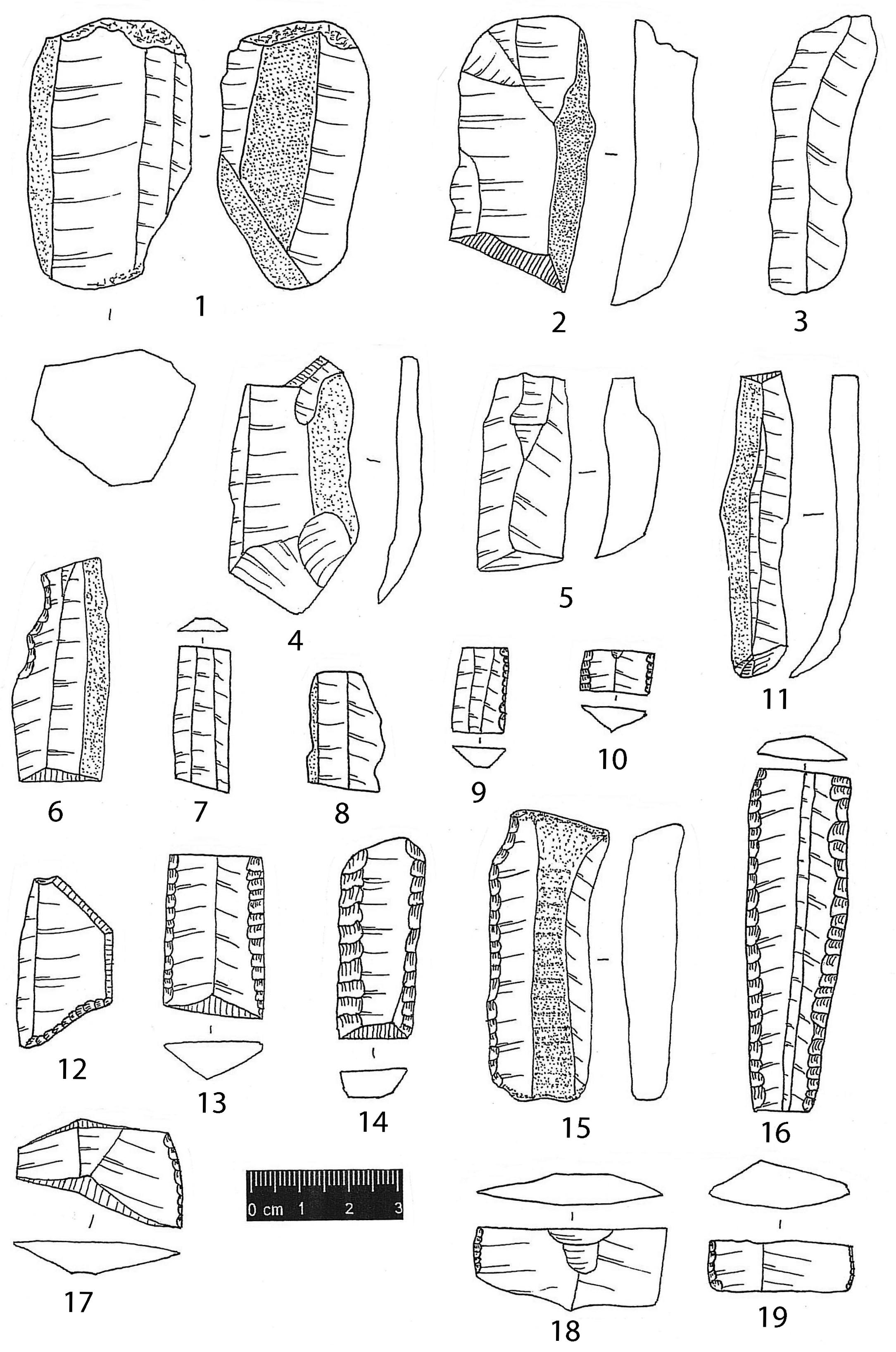 Бóльшая часть пластин с вторичной обработкой отретуширована со стороны спинки (10) (рис. 4, 9, 10, 13–19; 6, 11). По одной присутствуют пластины с ретушью со спинки и с брюшка, с отретушированным концом (рис. 4, 12) и с отретушированными выемками (рис. 4, 6). Десять пластин с вторичной обработкой представлены сечениями. Пластины имеют большой разброс как по длине (1,7–6,9 см), так и по ширине (1,0–3,7 см). Толщина пластин колеблется от 0,3 до 0,9 см. На четырех пластинах сохранилась первичная корка. Ретушью обрабатывались как один, так и оба края пластин (4). Трехгранные пластины с правильной огранкой относятся к энеолиту (рис. 4, 7–10). Явно ножом являлась пластина листовидной формы длиной 5,5 см, шириной 3,2 см, толщиной 0,7 см. Выполнена она из светло-серой слабоокремнелой породы. На обоих краях присутствует ретушь утилизации. Систематической ретушью со спинки и с брюшка подправлены только отдельные участки краев (рис. 6, 3). Интересны две пластины, которые дополнительно использовались в качестве ретушеров. Первый ретушер выполнен на сечении длиной 4,2 см, шириной 1,65 см и толщиной 0,6 см. Оба края обработаны крутой ретушью со спинки (рис. 4, 14). Второй ретушер изготовлен на пластине с отсеченным дистальным концом длиной 5,7 см, шириной 2,0 см, толщиной 0,9 см. Пластина обработана ретушью со спинки по всей длине края (рис. 4, 15). Ее поверхность сильно залощена. Оба конца смяты, выкрошены и заглажены от долгого использования. Изготовлена пластина из полосчатой агатовидной породы, которая на памятнике больше не встречена.