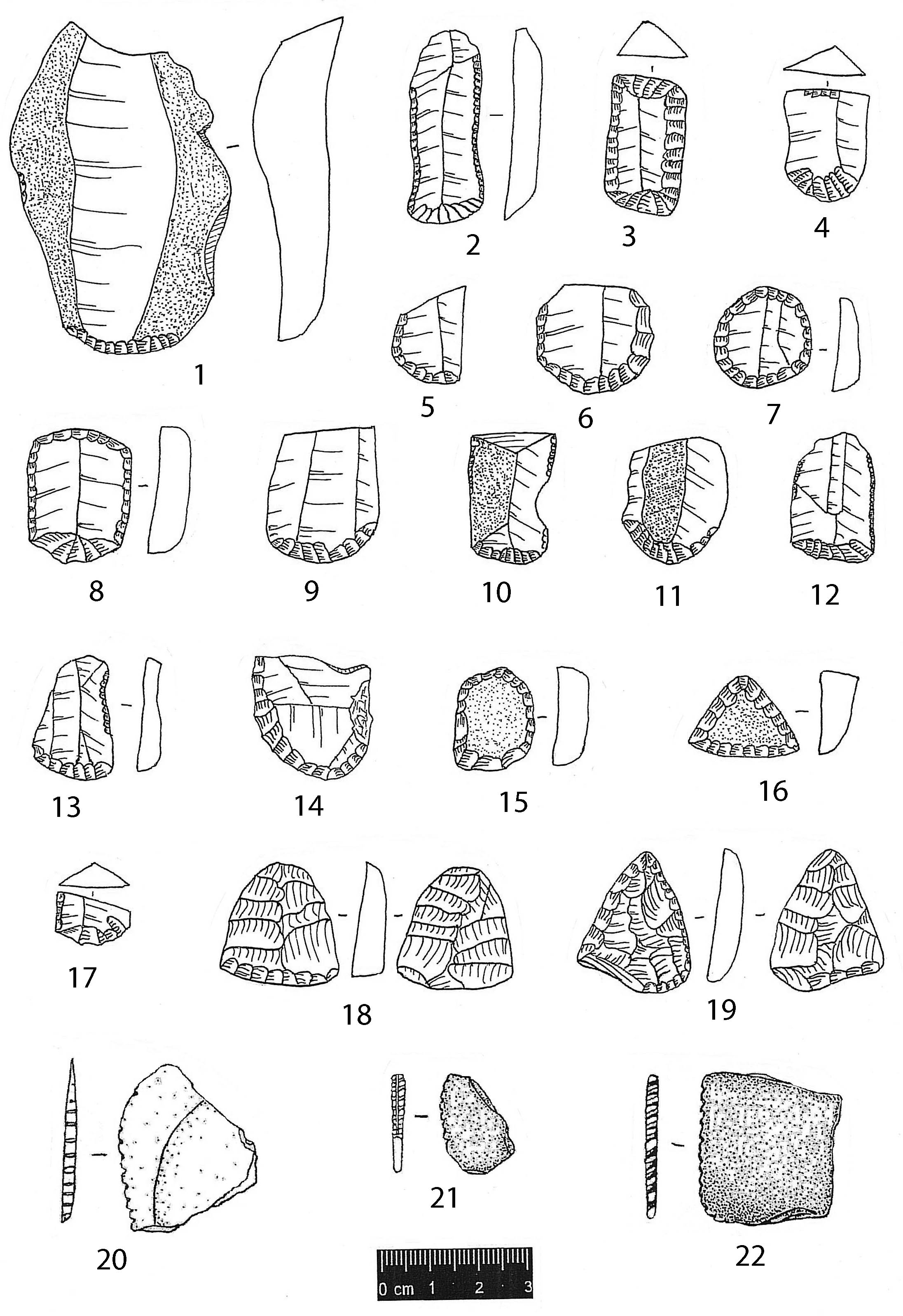Следует также отметить, что два скребка изготовлены из необработанных плиток кремнистого сланца и еще два – из сколотых ударных площадок нуклеусов. Единственное скребло выполнено на массивном отщепе алевротуфа длиной 6 см. Рабочее лезвие обработано ретушью со спинки.
