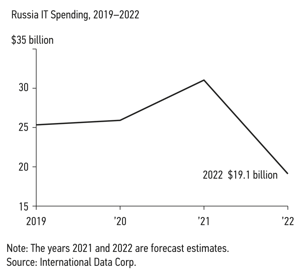 После введения в I квартале 2022 года экономических санкций в отношении Российской Федерации крупнейшие западные ИТ-гиганты, такие как Microsoft, Oracle, Cisco, IBM, Adobe, SAP, Intel, AMD и др., приняли решение ограничить или прекратить деятельность в нашей стране. В совокупности эти компании создали брешь во всём ИТ-секторе экономики нашей страны. По прогнозам консалтинговой компании IDC (International Data Corporation, США), объём ИТ-рынка в 2022 году сократится на 12,1 млрд долларов, что соответствует 39% относительно показателей 2021 года, и составит 19,1 млрд долларов (рис. 1)1.