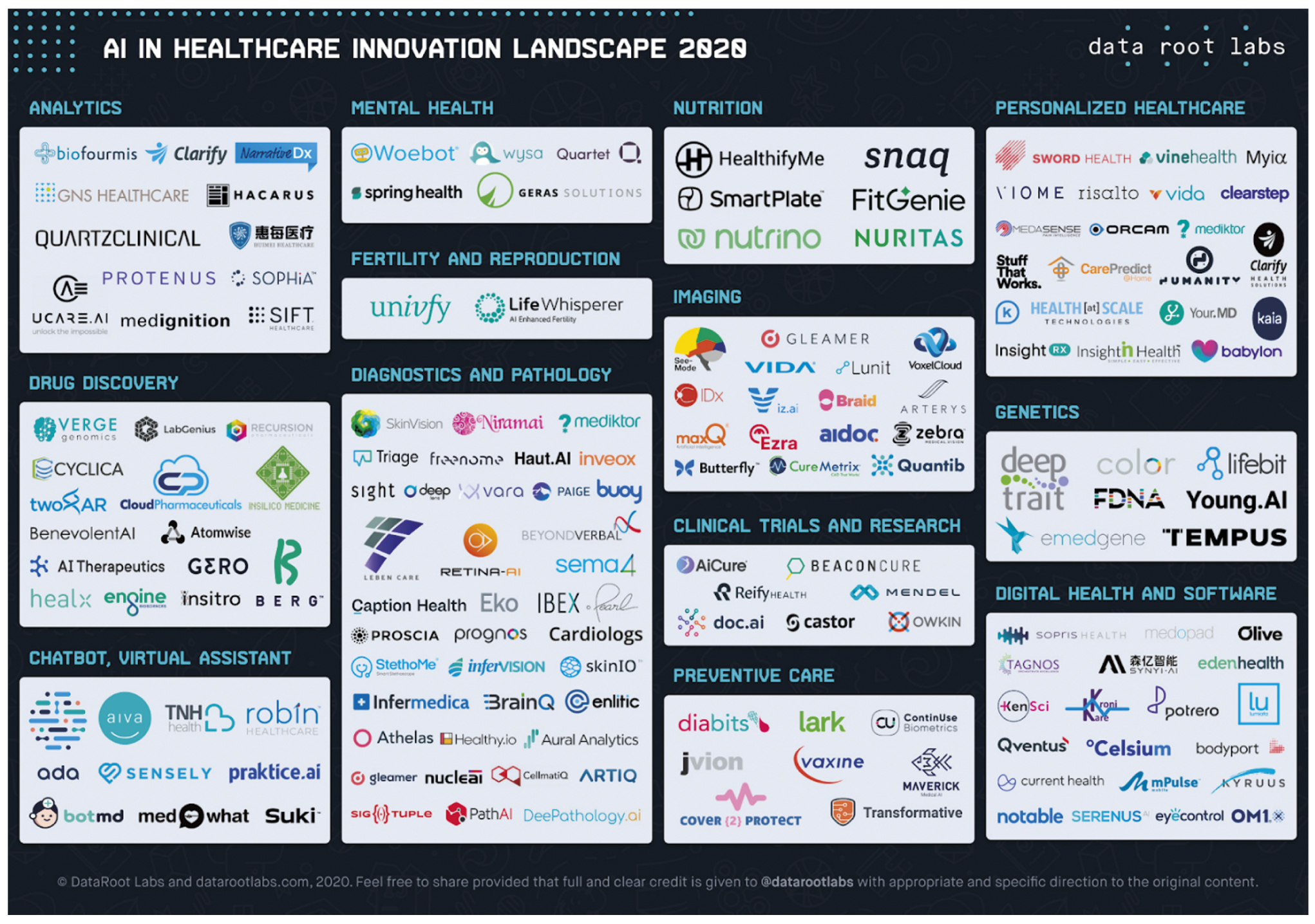 Такие ИТ-гиганты, как Amazon, Apple, Microsoft, инвестируют и покупают компании, работающие в сфере здравоохранения. Так, Amazon за 750 млн долларов купила PillPack для продажи лекарств онлайн. Alphabet инвестирует миллиарды долларов в Google Health с её десятками проектов, в том числе AI-роботами, для совершения различных операций и повышения эффективности скрининга ретинопатии при сахарном диабете. Apple создала Health App и продвигает Apple Watch в первую очередь как монитор для здоровья, а недавно открыла собственную сеть медицинских клиник. Microsoft приобрела компанию Nuance (компания из США, занимающаяся разработкой технологии распознавания голоса и ИИ для здравоохранения и других сфер) за 19,7 млрд долларов15.