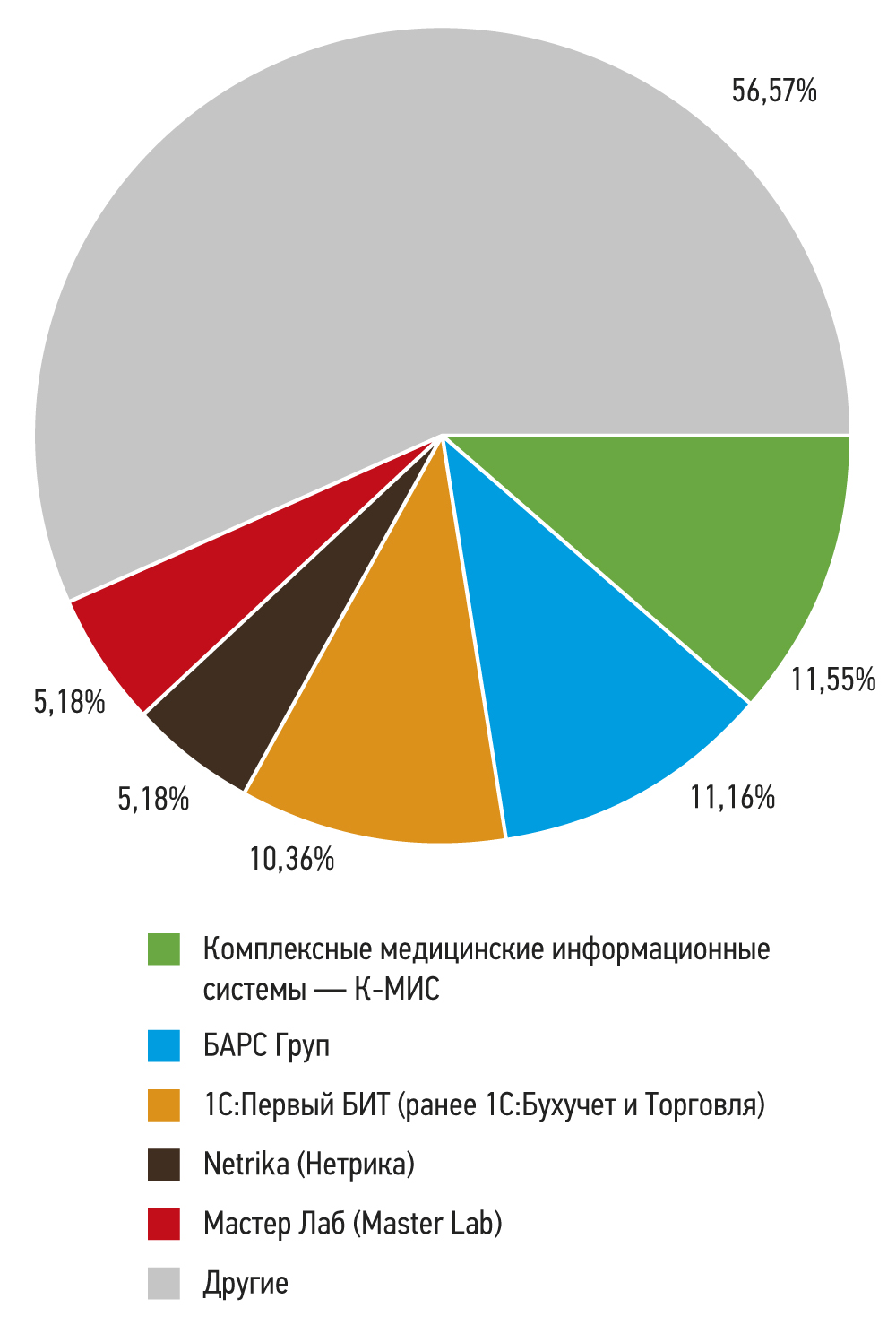 Разработками медицинских информационных систем (МИС) в Российской Федерации занимается более 70 ИТ-компаний. МИС — система автоматизации документооборота для медицинских учреждений, в которой объединены система поддержки принятия врачебных решений, электронные медицинские карты пациентов, данные медицинских исследований в цифровой форме, данные мониторинга состояния пациента с медицинских приборов, средства общения между сотрудниками, финансовая и административная информация. К первой десятке по количеству проектов в 2021 году отнесены следующие компании: «Комплексные медицинские информационные системы ― К-МИС», «БАРС Груп», «1С:Первый БИТ», «Нетрика», «Мастер Лаб», «СП.АРМ», «Корус Консалтинг», «СофТраст», «ТехЛАБ» и «ХОСТ ГК»24 (рис. 4).