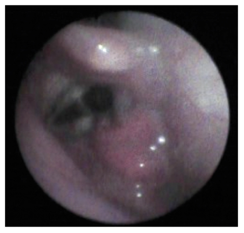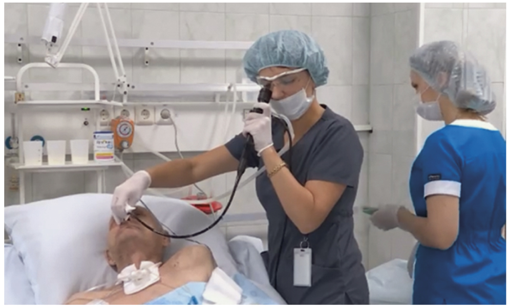 Рис. 1. Фиброоптическое эндоскопическое исследование функции глотания у пациента с хроническим нарушением сознания в отделении реанимации и интенсивной терапии.