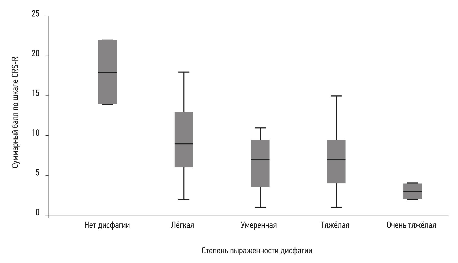 Степень тяжести дисфагии | Количество пациентов, n (%) | Суммарный балл CRS-R у каждого пациента | Средний балл CRS-R M±SD, Me [Q1−Q3] |
