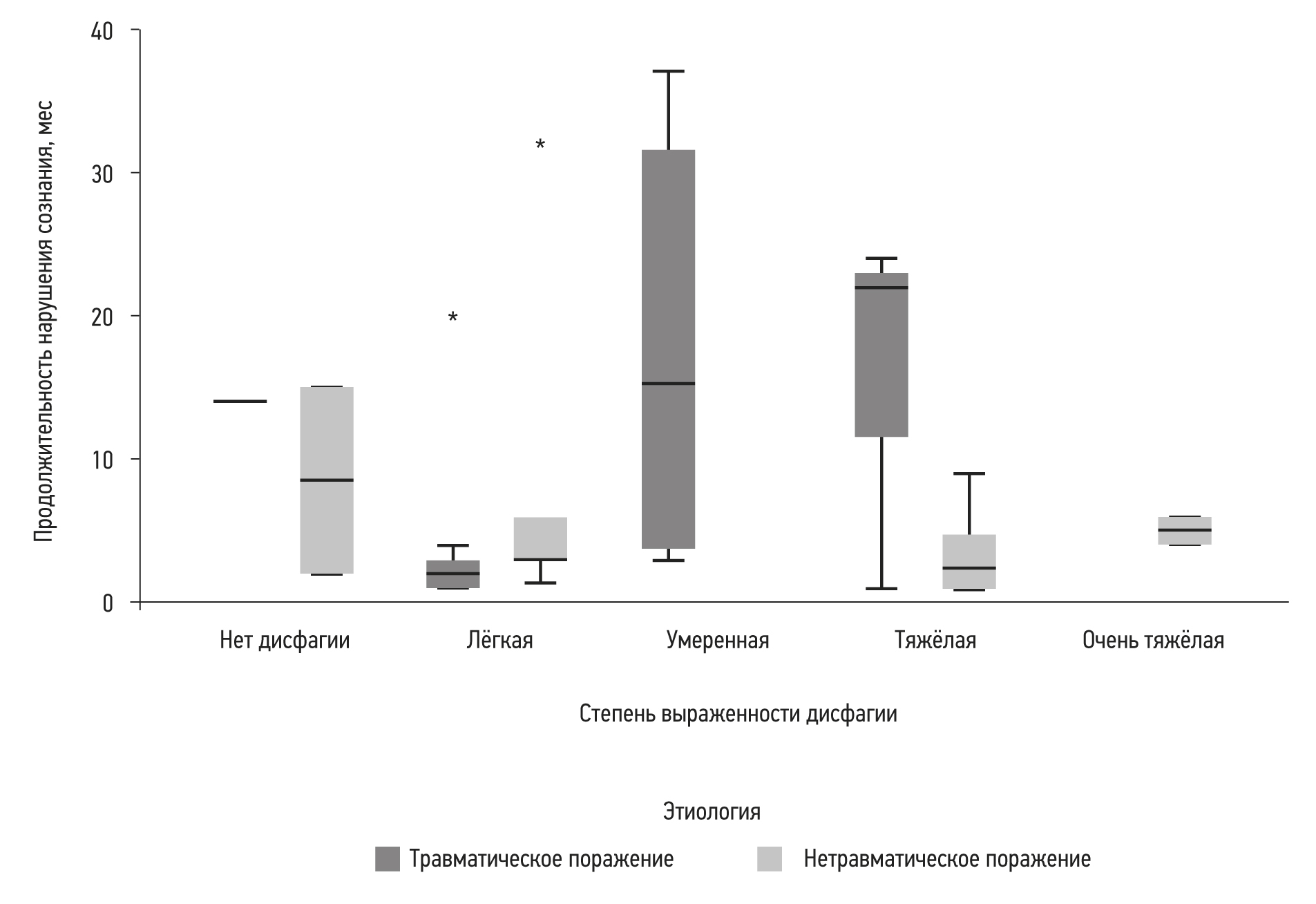 Рис. 3. Взаимосвязь длительности нарушения сознания и степени дисфагии (* различия статистически незначимы).