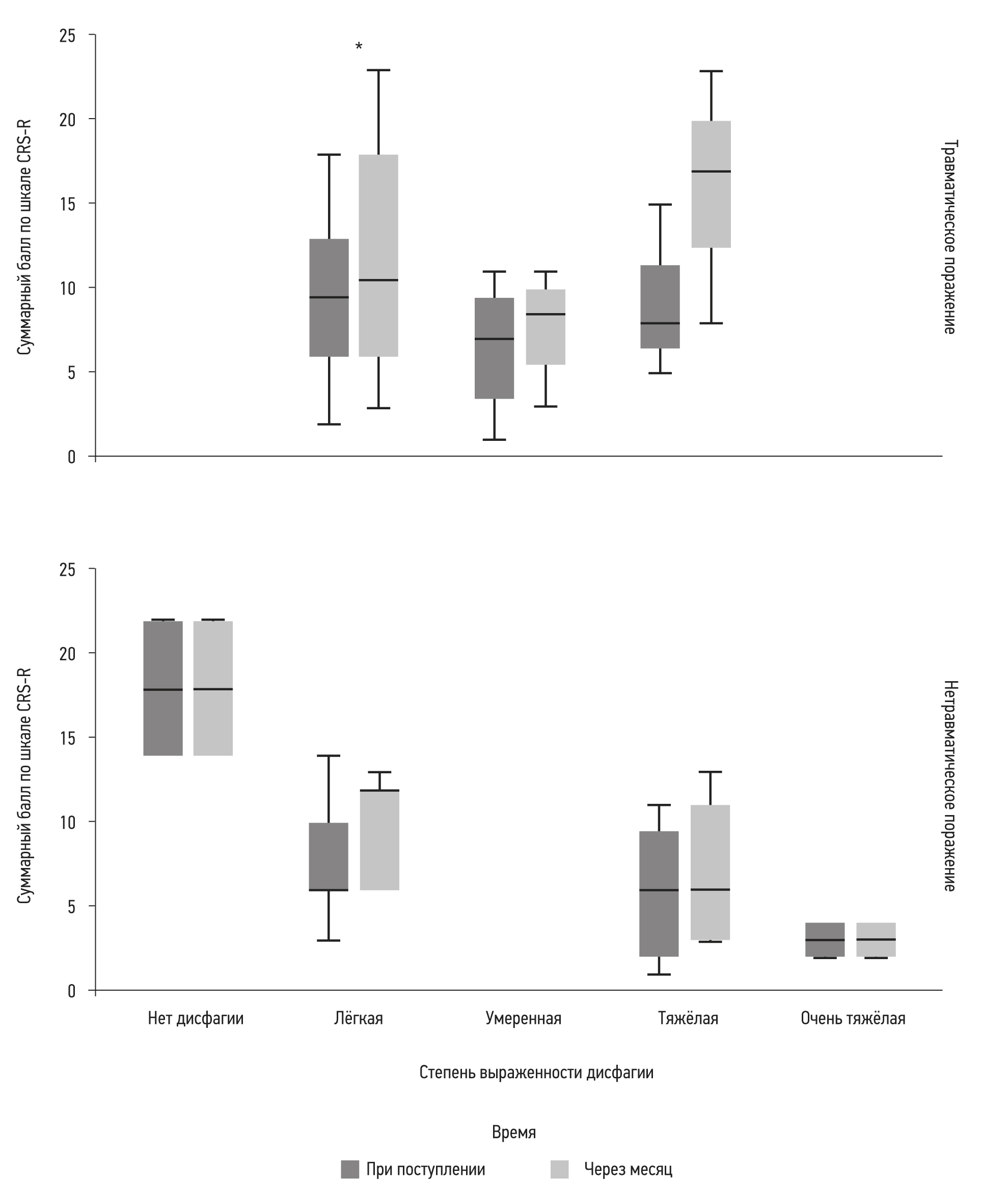 Проведено сопоставление степени тяжести дисфагии и динамики восстановления сознания по шкале CRS-R. Значимые различия в динамике восстановления сознания наблюдались только при лёгкой степени дисфагии у пациентов с травматическим поражением головного мозга, у которых отмечали лучшую динамику восстановления сознания в течение месяца последующего наблюдения (критерий Вилкоксона, р=0,026) (рис. 4).
