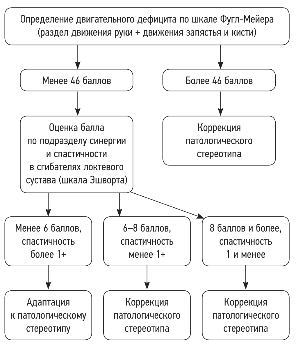 Как показали данные предыдущего исследования нашей группы, восстановление функциональных двигательных навыков в паретичной руке у пациентов, перенёсших инсульт, может происходить двумя разными путями: путём восстановления и путём адаптации [16]. На основании клинико-биомеханического портрета движений в паретичной руке нами был выработан алгоритм ведения постинсультных пациентов в зависимости от результатов тестирования по шкале оценки физического состояния Фугл-Мейера (Fugl-Meyer) и модифицированной шкале Эшворта (Ashworth) на первых этапах реабилитации (рис. 1).