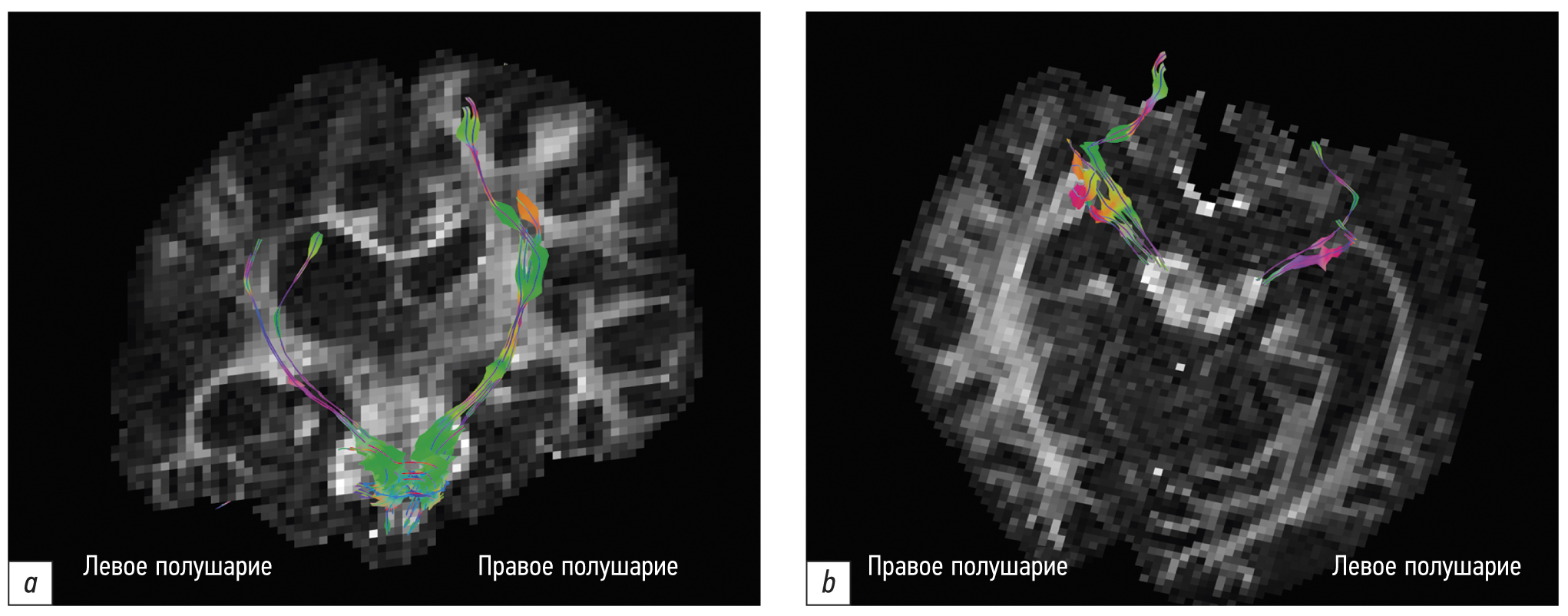 Рис. 2. Реконструкция кортикоспинальных трактов пациента: аксиальная (а) и коронарная (b) проекции. / Fig. 2. Reconstruction of the patient's corticospinal tracts: axial (а) and coronal (b) view.