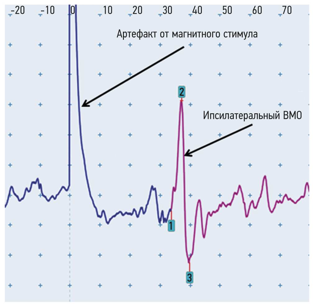 Регистрация ипсилатеральных ВМО проводилась с правой m. abductor pollicis brevis в условиях произвольного сокращения мышцы (30–50% от максимального сокращения). Точка для стимуляции соответствовала «горячей точке» в пределах правой первичной моторной коры для контралатеральной (левой) мышцы (точка, при стимуляции которой регистрируются ВМО с максимальной амплитудой). При стимуляции правой первичной моторной коры с интенсивностью 80% от максимальной с правой m. abductor pollicis brevis зарегистрированы воспроизводимые вариабельные по амплитуде ипсилатеральные ВМО с латентностью в пределах 30–35 мс. На рис. 3 представлен пример ипсилатерального ВМО с правой m. abductor pollicis brevis (короткая мышца, отводящая большой палец кисти) при стимуляции правой первичной моторной коры.