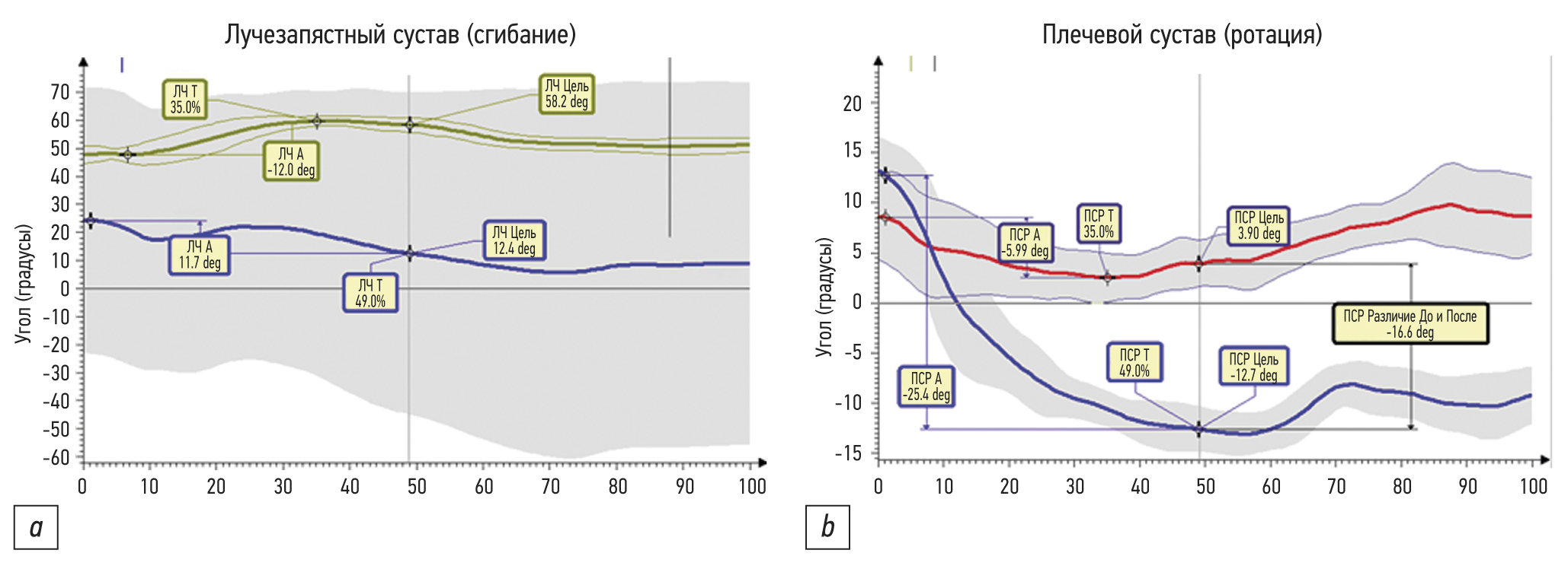 Рис. 4. Данные кинематики. Примечание. ПСР ― плечевой сустав, ротация; ЛЧ ― лучезапястный сустав; А ― амплитуда; Т ― время достижения максимума; Цель ― момент достижения удалённо расположенного объекта. / Fig. 4. Kinematic data. Note: ПСР ― shoulder joint, rotation; ЛЧ ― wrist joint; A ― amplitude; T ― timing of the maximal angle; Цель ― the moment of touching a remotely located object.