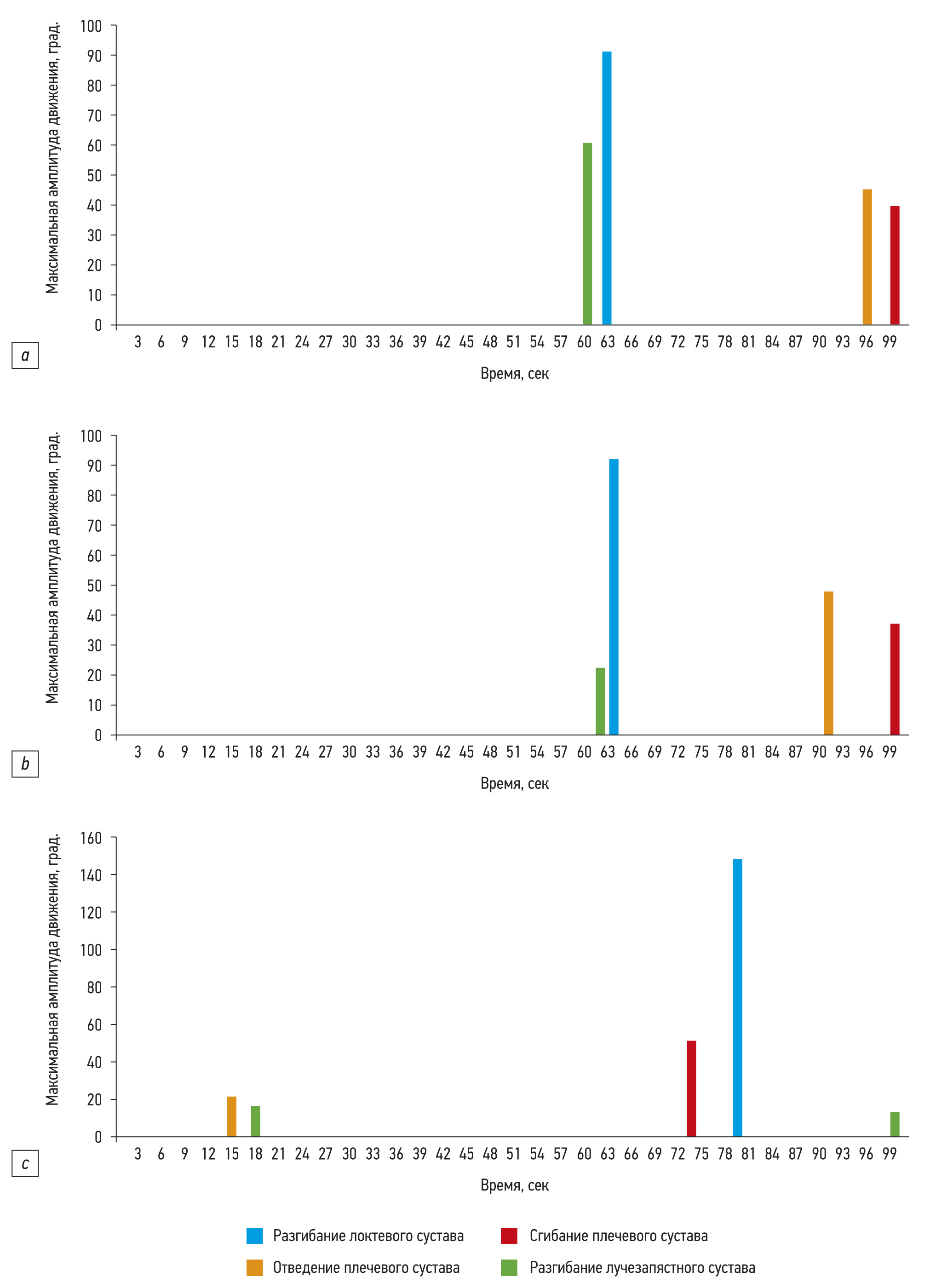 О неизменности кинематического паттерна также свидетельствуют диаграммы кинематического «портрета», отражающие время достижения максимальных углов в суставах во время выполнения «ричинга» (рис. 5).