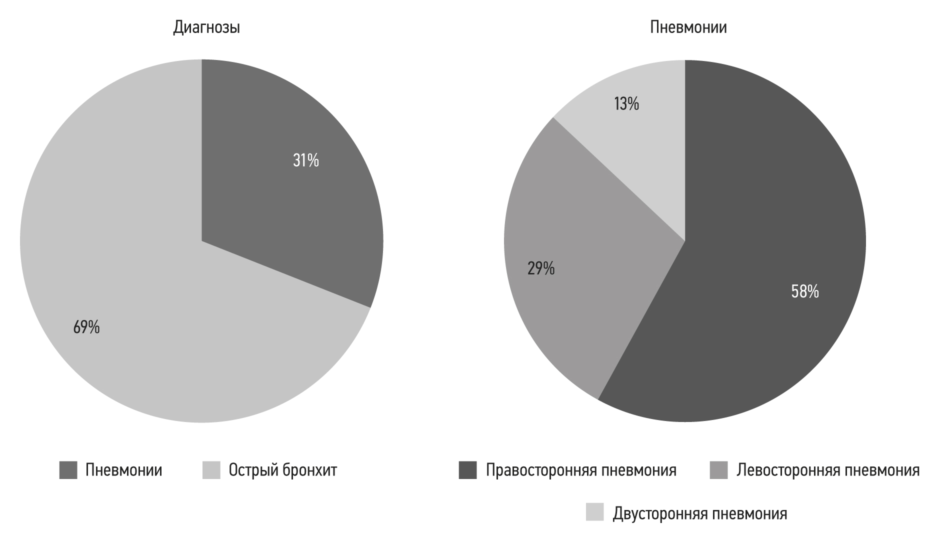 Всего обследован 201 ребёнок, из них 88 (44%) детей в возрасте 5–7 лет и 113 (56%) в возрасте 8–18 лет. С пневмонией госпитализированы 62 (31%) ребёнка, из них с правосторонней 36 (58%), левосторонней ― 18 (29%), двусторонней ― 8 (13%). С диагнозом острого бронхита госпитализированы 139 (69%) детей (рис. 1).