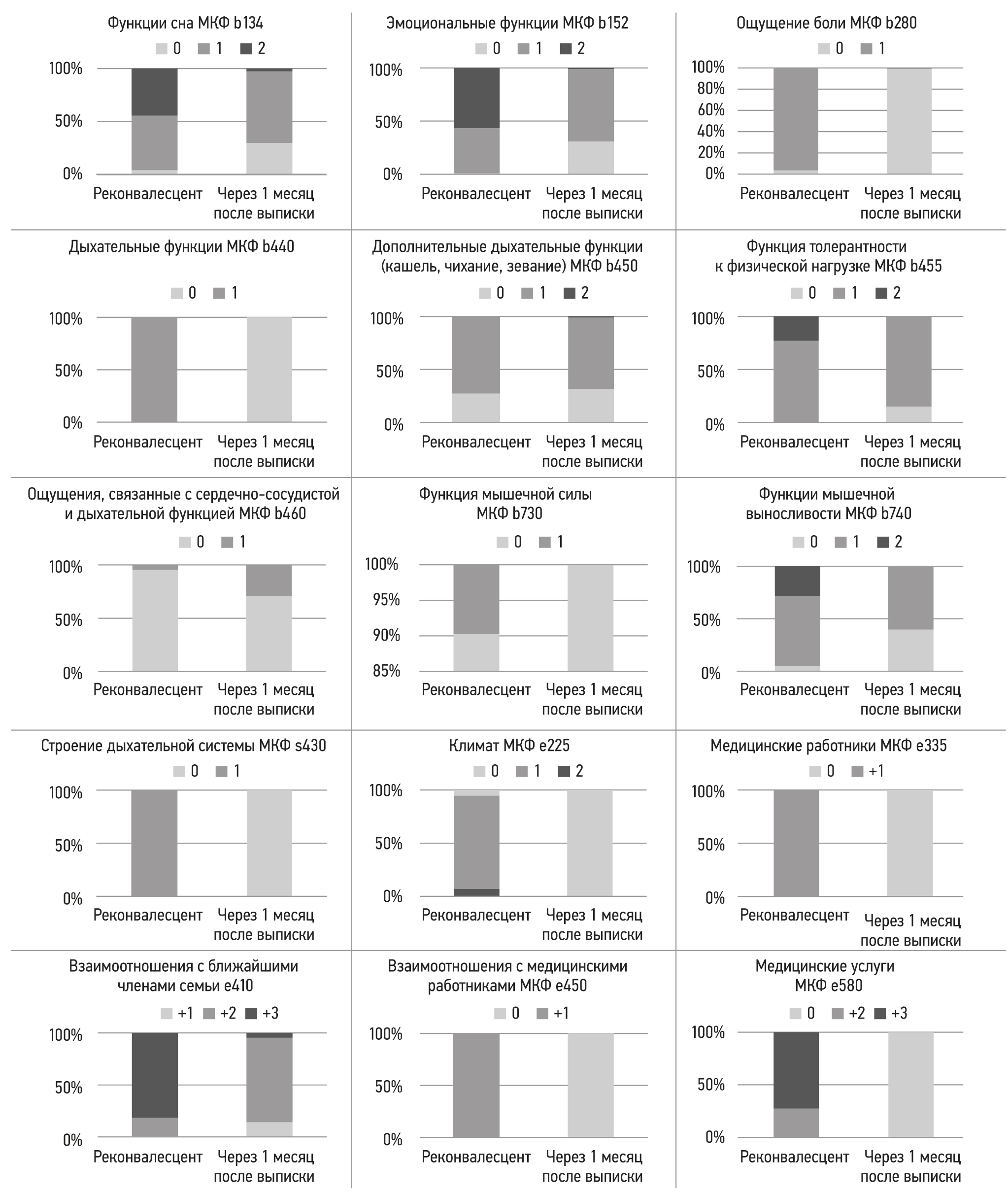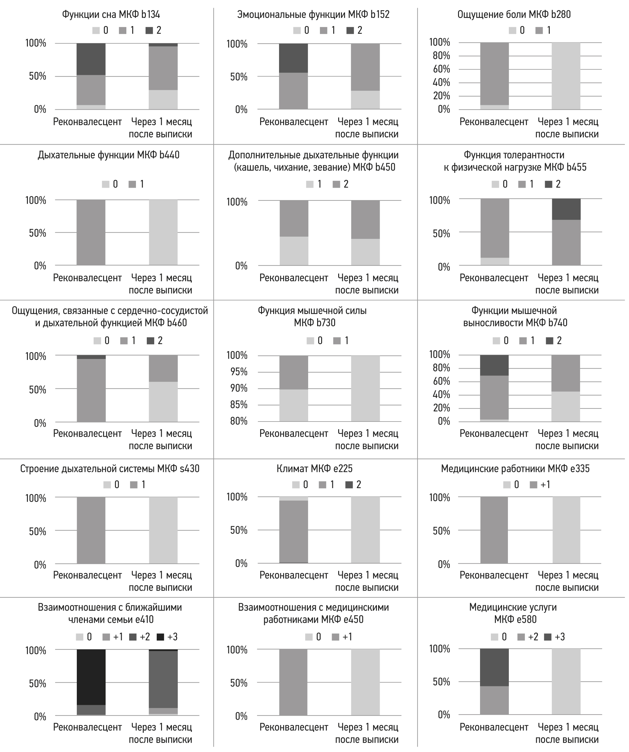 RESULTS: Most of the patients had significant impairments in the following functions: b134 Sleep functions; b152 Emotional functions; b280 Feeling of pain; b440 Respiratory functions; b450 Additional respiratory functions; b455 Exercise tolerance function; b460 Sensations associated with cardiovascular and respiratory functions; b730 Muscle strength functions; b740 Muscular endurance functions; b780 Sensations associated with muscles and motor functions, both at the time of discharge from the hospital and a month after the discharge. Environmental factors (e115 Products and technologies for personal use in daily life; e225 Climate; e260 Air quality; e310 Close relatives; e355 Medical workers; e410 Relationships with immediate family members; e450 Relationships with medical workers; e580 Medical services; e585 Services in education and training) were shown to have an influence on rehabilitation process.