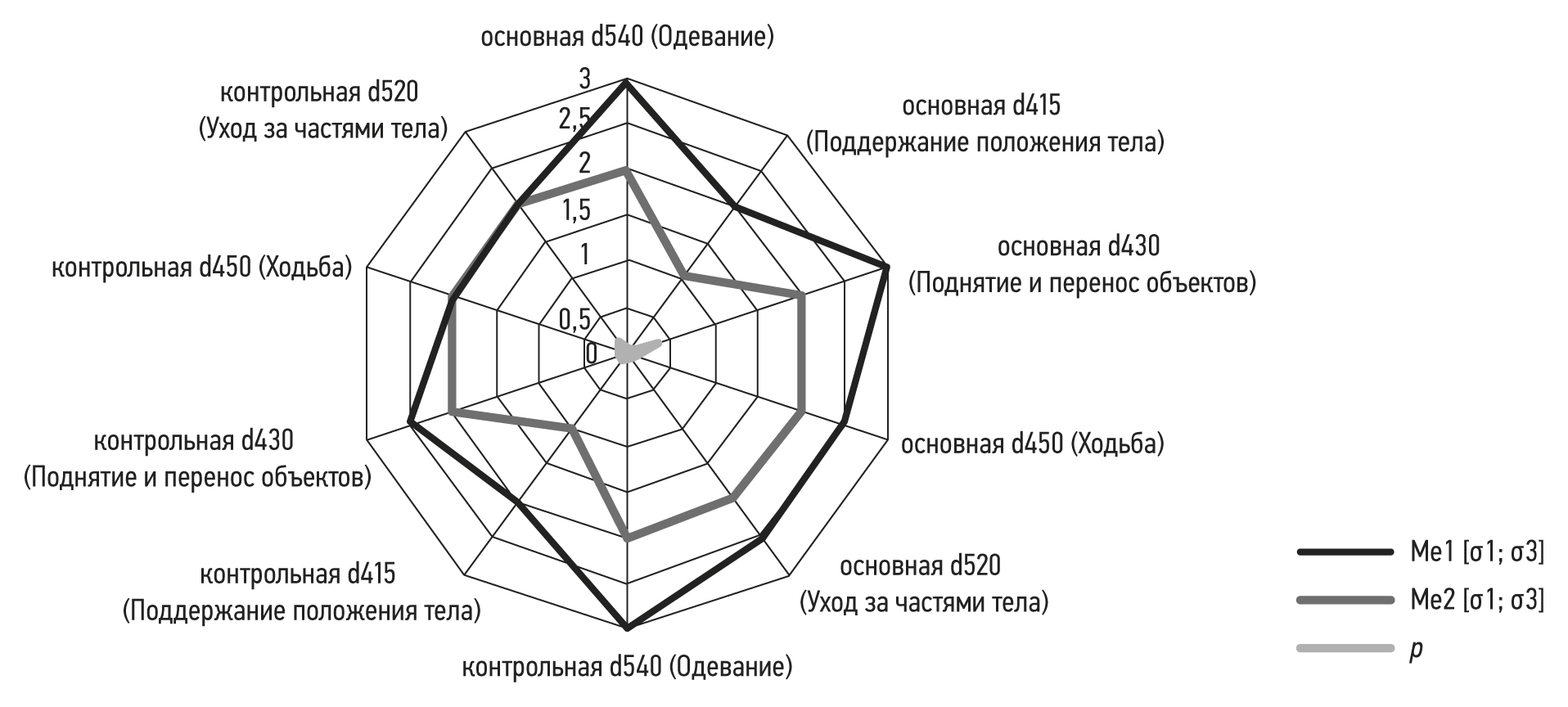 I (основная; n=45) | d540 Одевание | 0,002 | ||