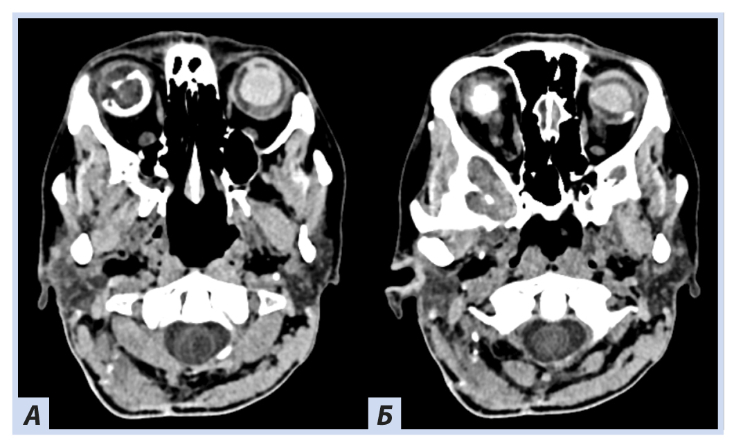 Примечание. А, Б — Т2- и Т1-взвешенные изображения. В полости правой глазницы объемное образование с неоднородным МР-сигналом; В — постконтрастное Т1-взвешенное изображение, режим подавления сигнала от жира: определяется интенсивное, но гетерогенное контрастирование образования. Кровоизлияние в сетчатку справа.