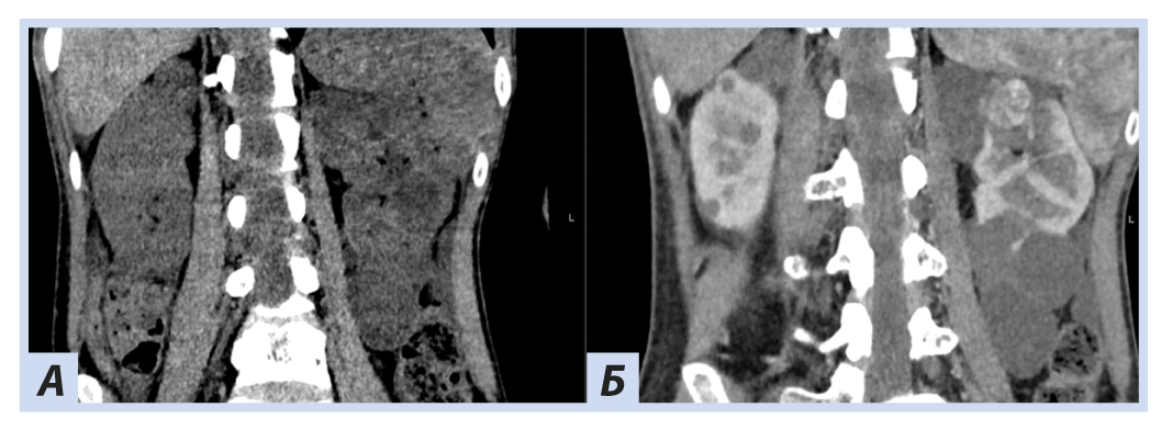 Примечание. А — нативная фаза: кисты обеих почек, солидный узел в верхнем полюсе левой почки; Б — артериальная фаза: кисты обеих почек более отчетливы на фоне контрастированной почечной ткани, солидный узел в верхнем полюсе левой почки с неоднородным накоплением контраста опухолью.