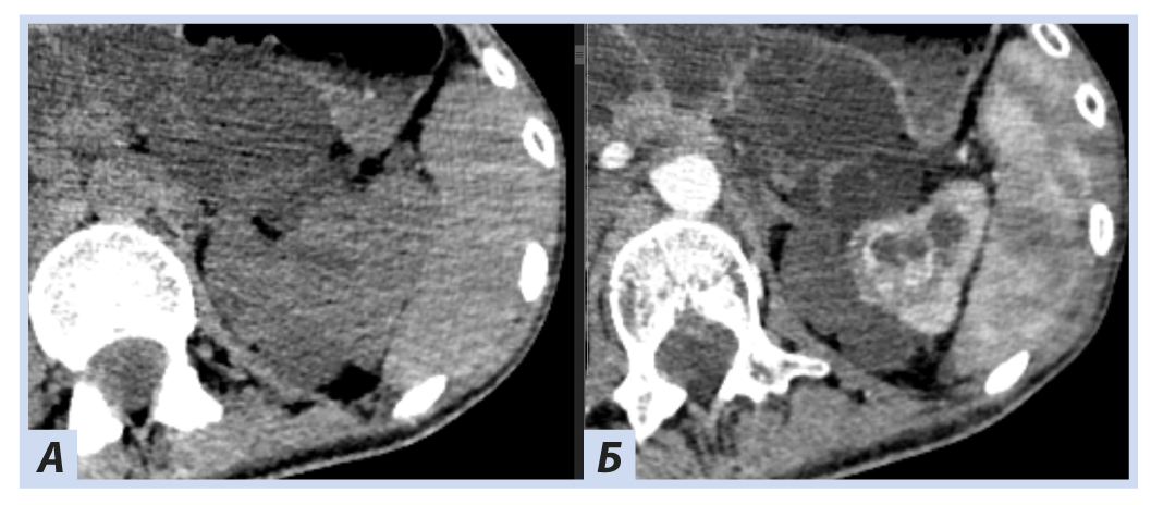 Примечание. А — нативная фаза: кистозно-солидное образование левой почки; Б — артериальная фаза: кистозно-солидное образование левой почки с неоднородным накоплением контраста опухолью.