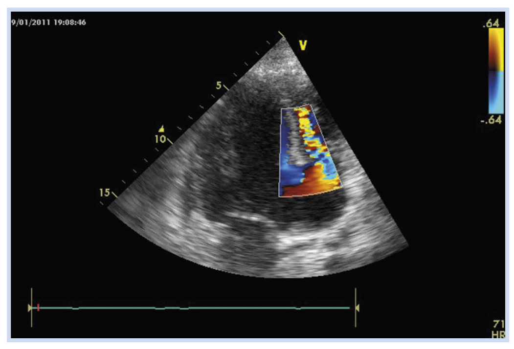 Рис. 2. Пациент К., эхокардиография: заднебазальный инфаркт миокарда, постинфарктная аневризма сердца с разрывом и расслоением межжелудочковой перегородки