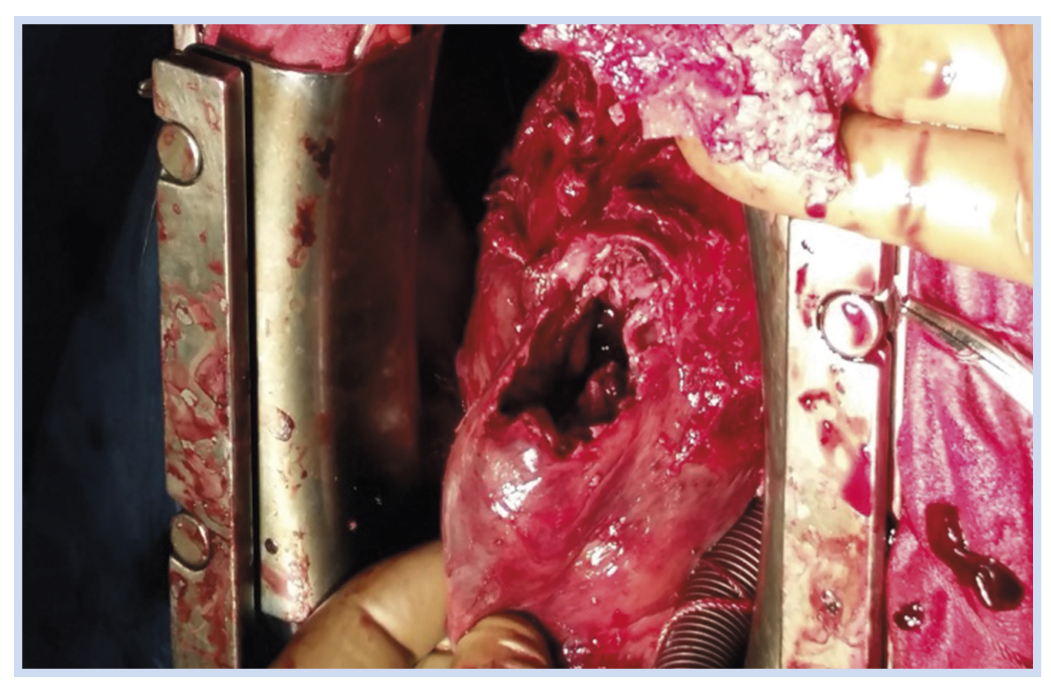Рис. 3. Пациент Л., 51 год. Операционное фото. Разрыв свободной стенки левого желудочка с формированием ложной аневризмы