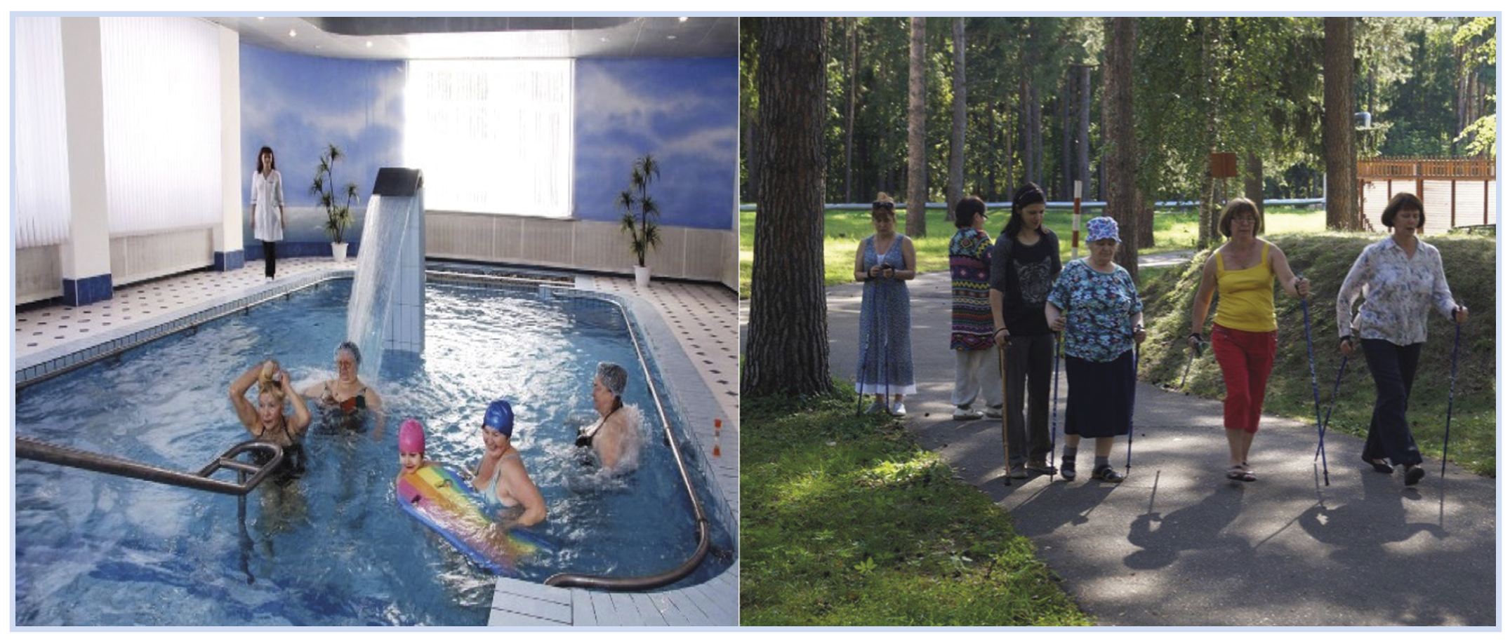 Физические тренировки заключаются в дозированной ходьбе по пересеченной местности, подъемах по лестнице, плавании в бассейне, занятиях на тренажерах. Первые тренировки назначаются по 3 или 4 раза в неделю продолжительностью 15–20 мин с постепенным увеличением в последующем объема нагрузок и их интенсивности (дистанция и темп ходьбы). Нагрузки строго дозируются и персонифицируются лечащим врачом санатория в соответствии с пороговым значением частоты сердечных сокращений (ЧСС), определенным при тесте шестиминутной ходьбы или велоэргометрической пробе. Прогулочная ходьба осуществляется ежедневно с нагрузкой не более 50% от пороговой, полученной при нагрузочной пробе [29].