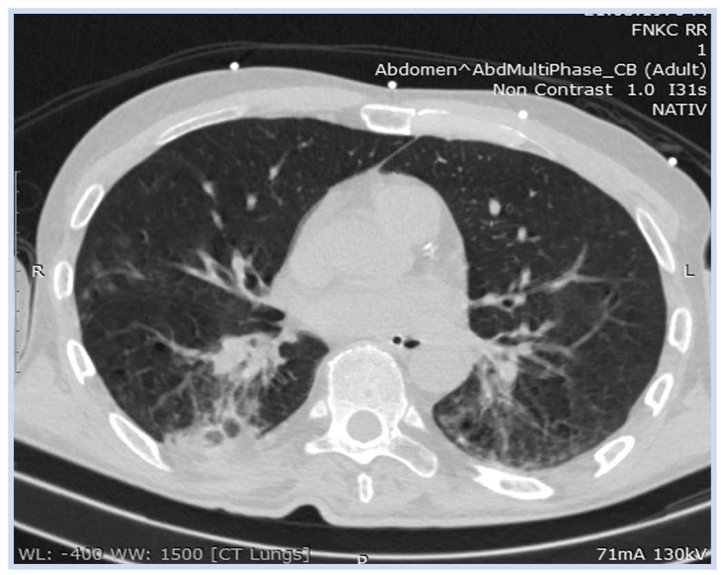 По результатам компьютерной томографии (КТ) при поступлении у пациента выявлены признаки двусторонней нижнедолевой пневмонии (рис. 1), значительная лейкоцитурия (табл. 1). Пациенту была назначена антибактериальная терапия с положительным эффектом (табл. 1–3).