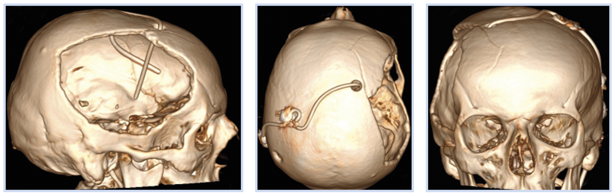 Рис. 2. Пациент К., 50 лет, с посттравматической гидроцефалией и посттрепанационным дефектом костей свода черепа: спиральная компьютерная томограмма в виде 3D-реконструкции от 30.03.2020