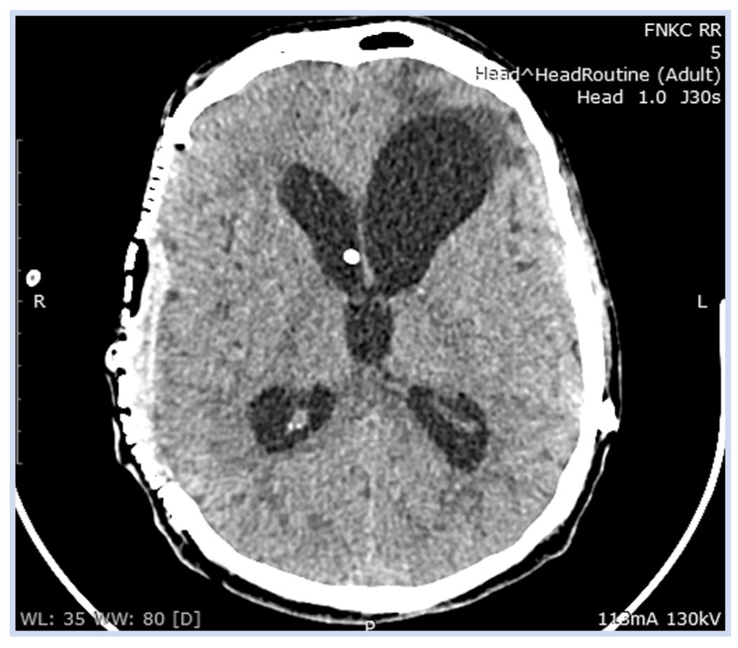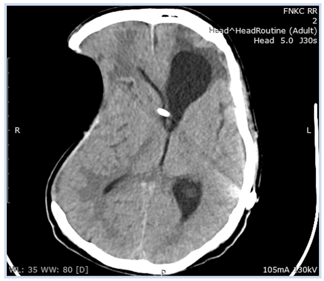 На КТ головы от 31.03.2020: линейный перелом лобной кости справа. Справа определяется постоперационный дефект на уровне лобной, теменной и височной костей размером ~107 × 93 мм, на этом же уровне отмечается западение вещества головного мозга в дефект, максимально до ~30 мм. Вентрикулярный катетер шунта в левом боковом желудочке. Постоперационные изменения в правой гемисфере, латеральная дислокация головного мозга влево до 17,5 мм на уровне прозрачной перегородки. Очаг измененной плотности на границе лобной и теменной долей правой гемисферы следует дифференцировать между гематомой в поздней подострой стадии и постоперационными изменениями. Сглаженность борозд, вероятнее всего, обусловлена последствиями изменения внутричерепного давления, нельзя исключить проявление отека вещества головного мозга левой гемисферы (рис. 3).