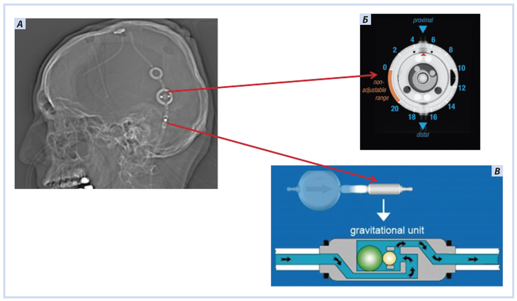 Примечание. На краниографическом изображении (А) видны компоненты шунтирующей системы и схематичные изображения регулируемого клапана ProGAV (Б) и гравитационного клапана SA (В).