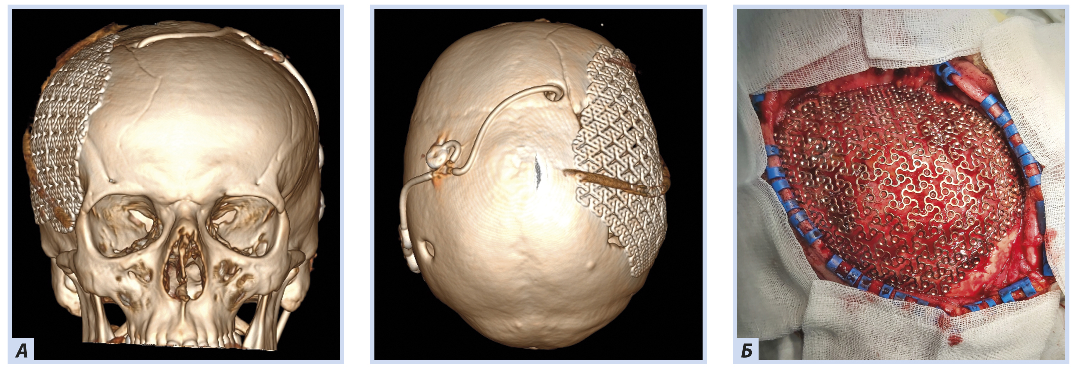 Примечание. А — данные 3D-реконструкции компьютерной томограммы головы пациента после операции (на снимках видно удовлетворительное положение титанового имплантата); Б — интраоперационная фотография титанового имплантата, уложенного на дефект костей свода черепа в правой лобно-теменно-височной области.