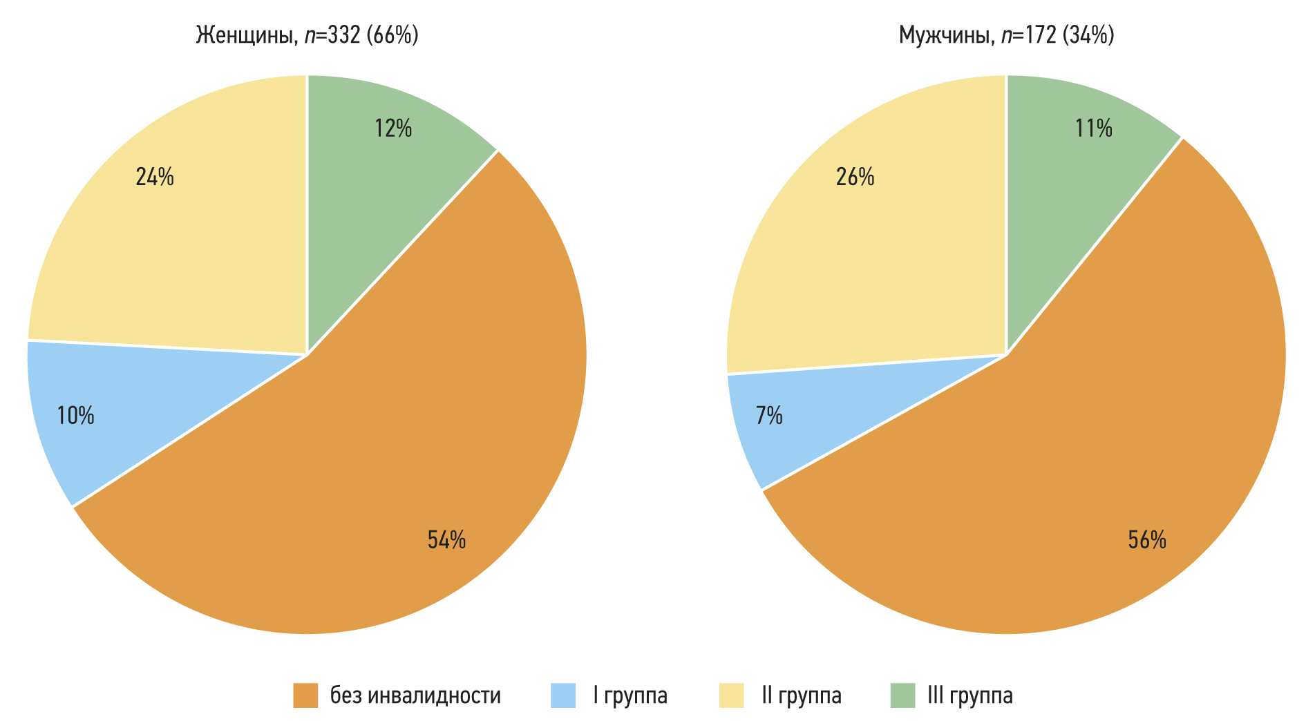 MATERIALS AND METHODS: The medical histories of patients aged from 31 to 58.8 (average age 48.9±8.6) years who were in hospital treatment were analyzed (n=504; men — 34%, women — 66%), of which 56% had no disability, 11% had disability group I, 25% had disability group II, and 8% had disability group III.