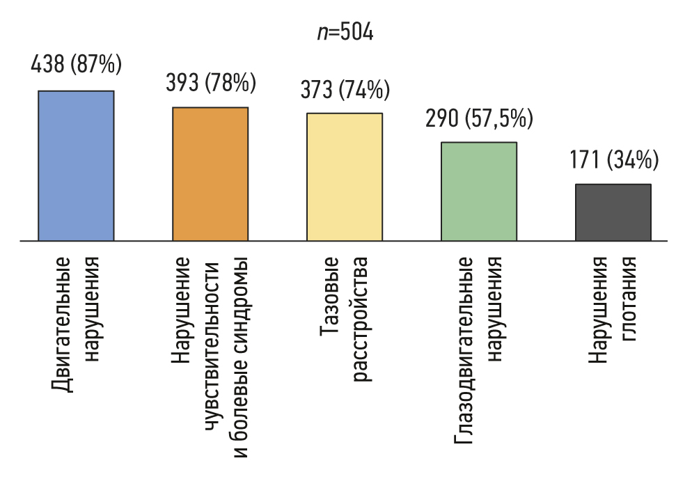 Среди наиболее частых жалоб у пациентов с РС, по данным реабилитационной службы ФГБУ ФЦМН ФМБА1, выделены следующие нарушения и дисфункции (в порядке убывания): двигательные нарушения (87%); чувствительные нарушения и болевые синдромы (78%), тазовые расстройства (74%), глазодвигательные нарушения (57,5%), бульбарные нарушения (34%). В зависимости от степени тяжести болезни у пациентов наблюдалось сочетание нескольких функциональных нарушений и патологических паттернов, влияющих на их активность и мобильность (рис. 2).