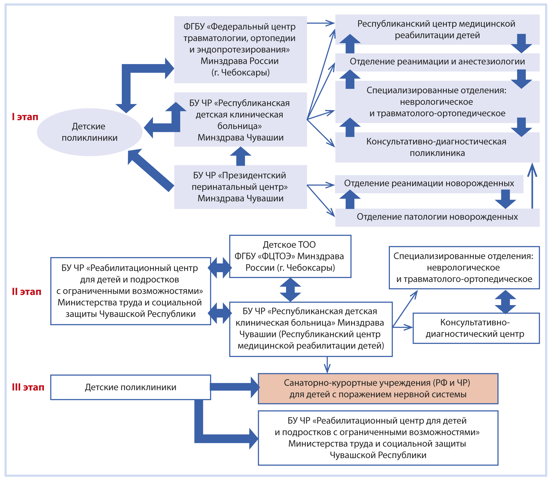 В Чувашской Республике ведется Регистр детей с ДЦП. Персонифицированная информация о данной категории пациентов дала возможность организовать их учет, определять уровни курации, отслеживать этапы лечения и реабилитации с оценкой результатов. Организационная модель реабилитационного маршрута детей с ДЦП в Чувашской Республике включает сеть учреждений, подведомственных Минздраву и Минтруда Чувашии, и ФГБУ «Федеральный центр травматологии, ортопедии и эндопротезирования» Минздрава России (Чебоксары; ФЦТОЭ) (рис. 1).
