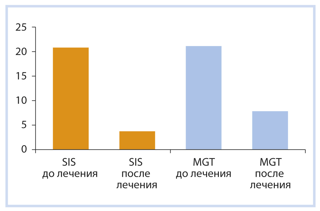 Результаты группы лечения. Сравнение показателей опросника CAPSQ до и непосредственно после лечения продемонстрировало существенные достоверные изменения (p<0,001) — 20,8±7,0 и 3,7±3,9 баллов соответственно.