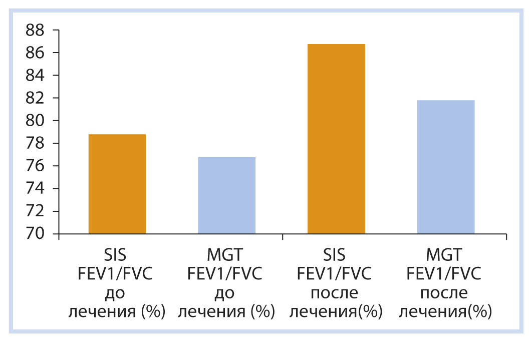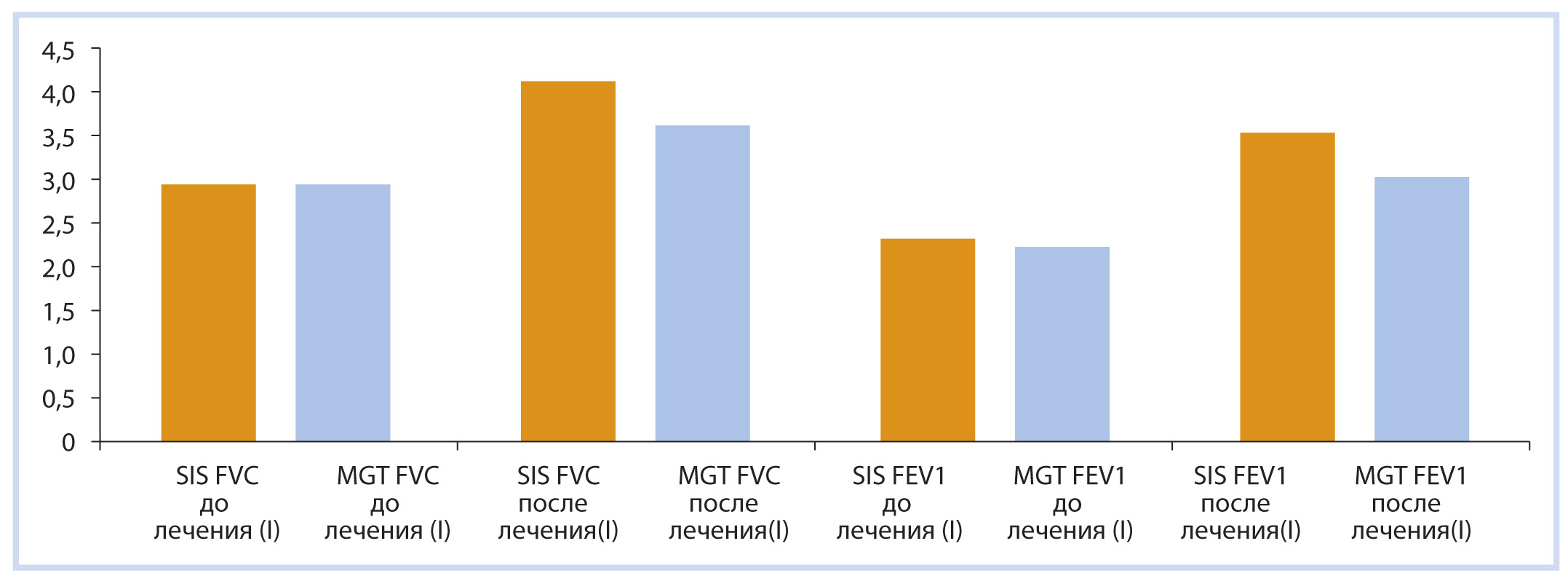 Рис. 3. Результаты спирометрии. Примечание. SIS (super inductive system) — группа лечения высокоинтенсивным (1–2 Тл) электромагнитным полем; MGT (magnetic therapy) — низкоинтенсивная магнитотерапия в группе контроля; FVC/ FEV1 — показатели форсированной жизненной емкости легких / объема форсированного выдоха за одну секунду.