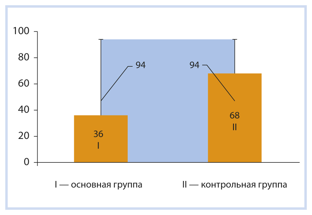 Вместе с тем в основной группе пациентов, у которых в программе логопедической помощи применялся пассивно-активный логопедический криомассаж, показатели были достоверно выше (р≤0,05). Так, при равном в основной и контрольной группах исходном суммарном балле дисфагии (94 балла) по завершении реабилитационных мероприятий в основной (I) группе данный показатель составил 36 баллов, тогда как в контрольной (II) — 68 (рисунок).