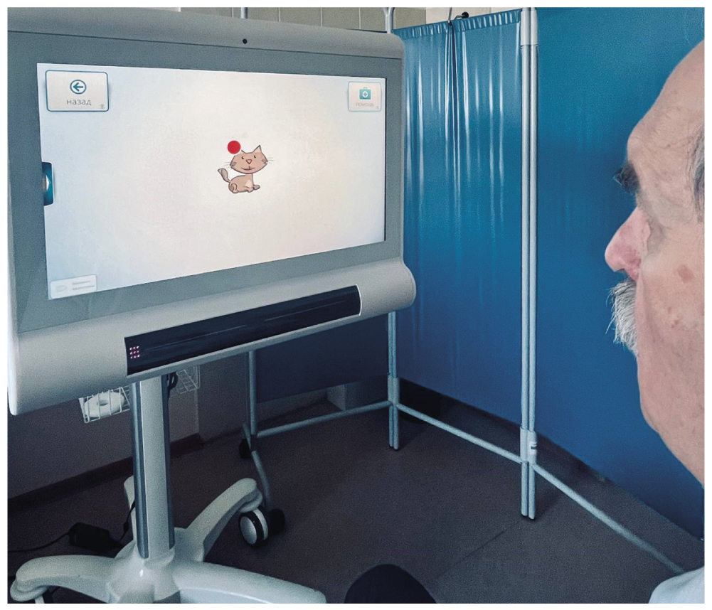 2. Fig. 1. Rehabilitation session of a patient with hemianopia on an alternative communication device using the eye-tracking method C-Eye II Pro (AssisTech Sp. Z o.o., Poland) at the Federal State Budgetary Institution “Federal Center for Brain and Neurotechnology” of the FMBA of Russia. Saccadic training (SCT) was performed: when the patient fixes his/her gaze (the red circle is the patient’s gaze) on the stimulus (cat), the stimulus moves to another position.