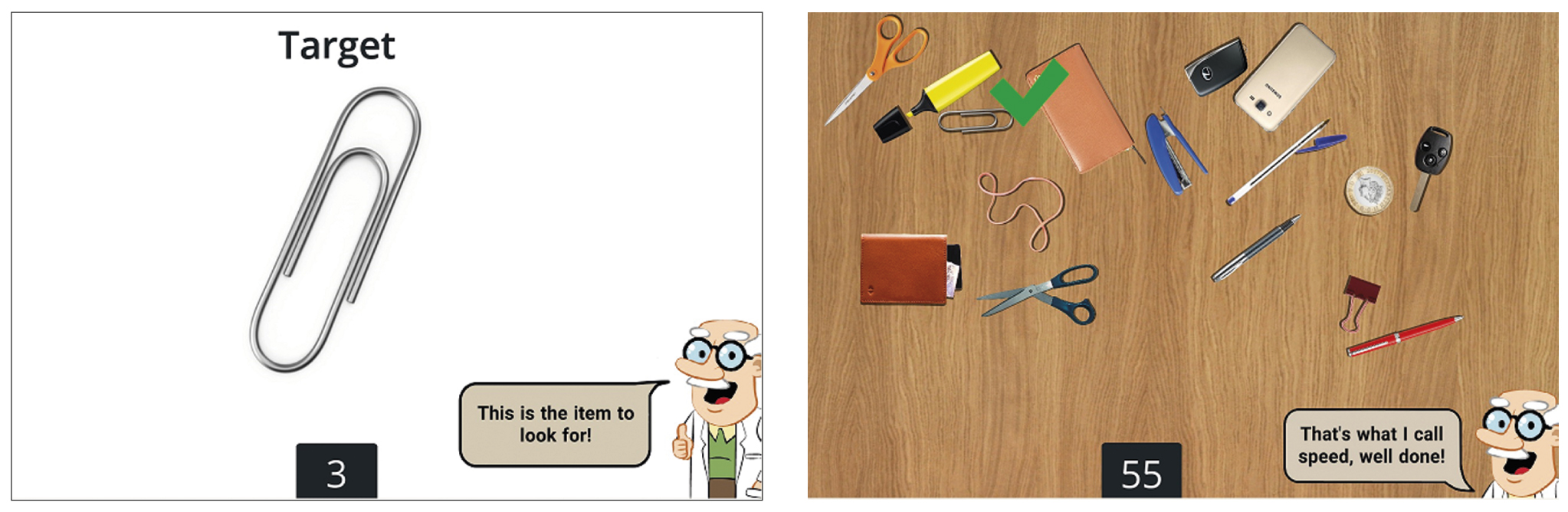 Fig. 2. Free Eye-Search Therapy Software (https://www.eyesearch.ucl.ac.uk) for saccadic training. Left: familiarization of the patient with the target stimulus (paper clip). Right: a correctly completed task through the detection of the target stimulus using a computer mouse.