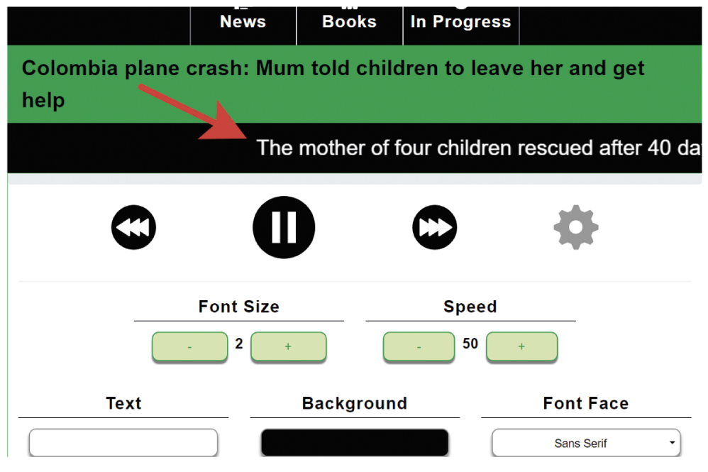 Fig. 3. Training of hemianopic reading on the free English Read-Right service (https://www.readright.ucl.ac.uk/). The red arrow indicates the movement of the text string from right to left. The text presentation settings are shown below.