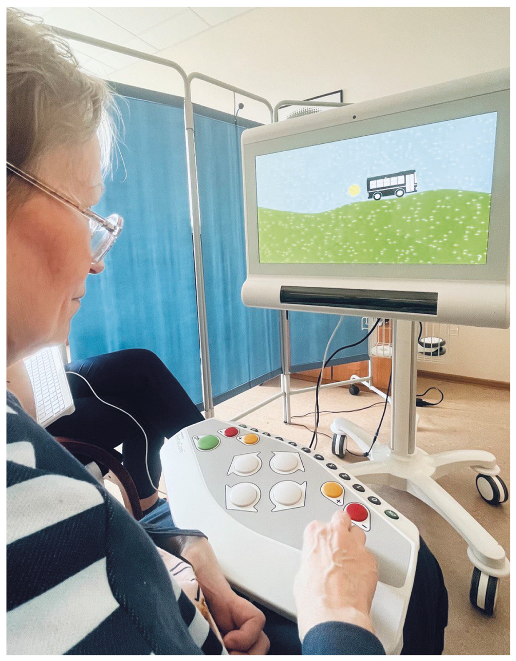 5. Fig. 4. Rehabilitation session of a patient with neglect syndrome on a RehaCom (HASOMED GmbH, Magdeburg, Germany) (in this modification, the simulator is built into C-Eye II Pro, but no eye tracking was carried out in the simulator) at the Federal State Budgetary Institution “Federal Center for Brain and Neurotechnology” of the FMBA of Russia. Visual training (VST) is performed in the “Saccades” module: the patient fixes his/her gaze in the center (in the sun) and must detect which side (left or right) the target stimulus (bus) appeared by pressing the corresponding button on the keyboard. White “snowflakes” on the monitor as additional optokinetic stimulation from right to left.