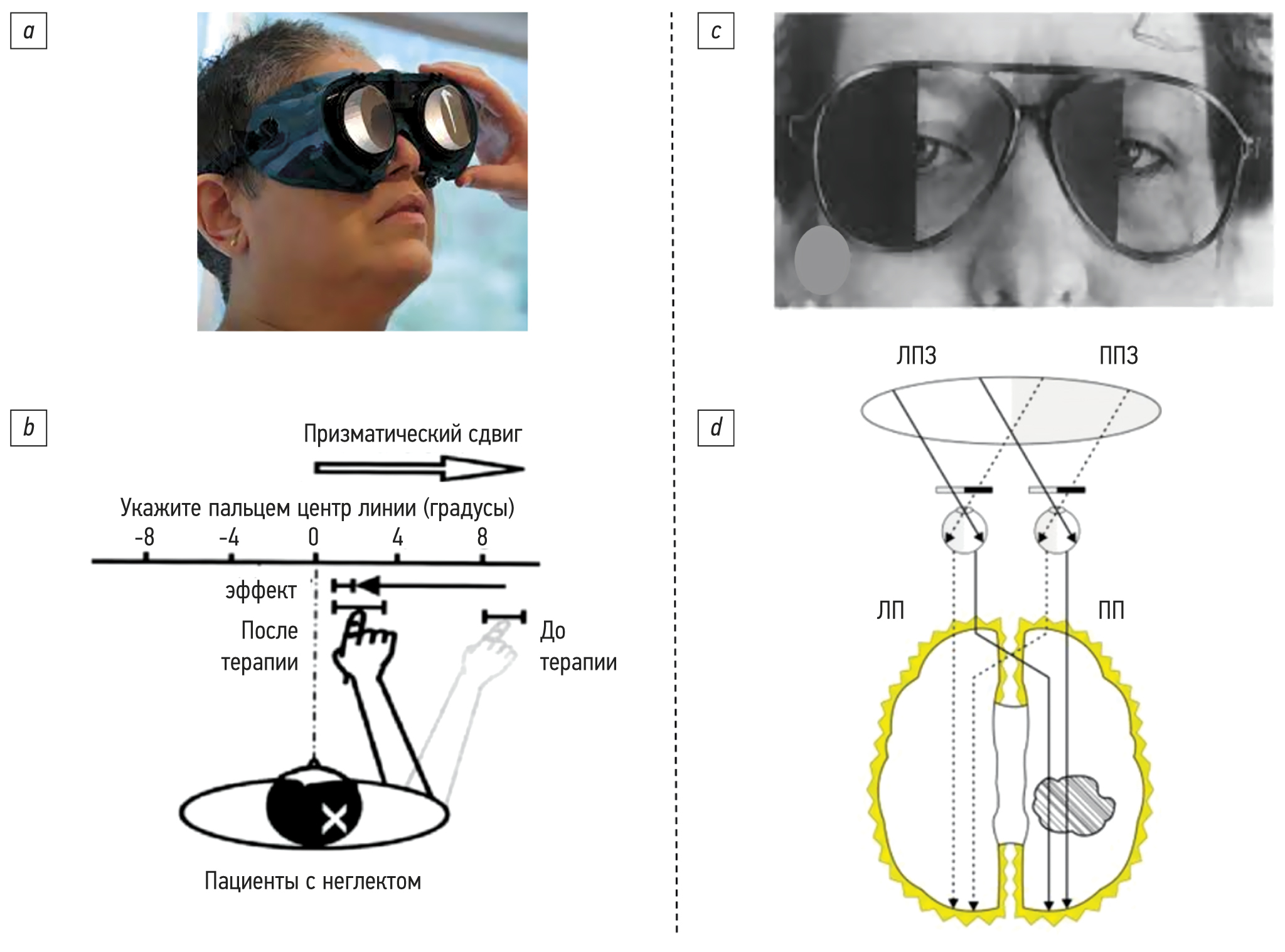 6. Fig. 5. Passive therapies of neglect syndrome: prism adaptation (а, b) and eye patching (с, d). а — appearance of the prismatic goggles; b — adaptation of the patient following prism therapy (the ipsilateral error to the right when indicating the center of the line becomes smaller after therapy); с — appearance of glasses with patches; d — offering patches on the right half-fields of vision of both eyes in patients with left-sided neglect and stroke of the right hemisphere; the right hemisphere is stimulated, and the activation of the left hemisphere decreases, which leads to the restoration of interhemispheric balance. (According to N. Smania et al., [54] and Y. Rossetti et al., [56], with changes). ЛПЗ — left field of vision; ППЗ — right field of vision; ЛП — left hemisphere; ПП — right hemisphere.