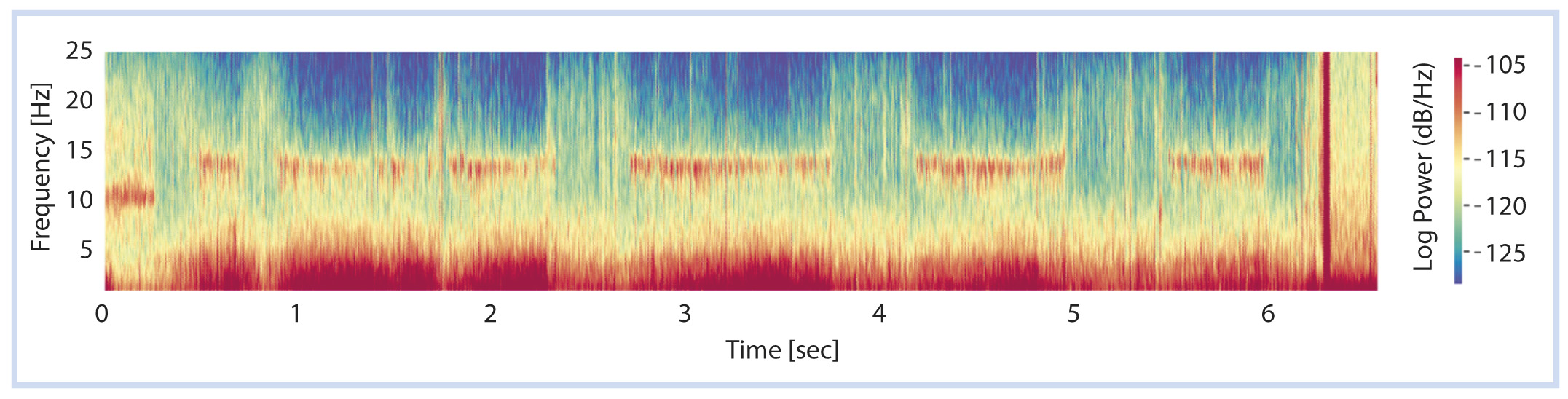 На сегодняшний день одним из самых распространенных инструментов для компьютерной обработки ЭЭГ повсеместно признается спектральный анализ [10], целью которого является построение функции распределения мощности сигнала в зависимости от частоты, т. е. спектральной плотности мощности (СПМ). Для этого используется преобразование Фурье, ставящее в соответствие непрерывному во времени бесконечному сигналу другую непрерывную бесконечную функцию, описывающую коэффициенты разложения исходного сигнала на элементарные составляющие — гармонические колебания. Для дискретных во времени (в т. ч. цифровых) сигналов используется дискретное преобразование Фурье. Если сигнал имеет нестационарную природу, т. е. его СПМ меняется со временем, то построение только одного распределения мощности для такого сигнала будет недостаточно информативно. В этом случае используется оконное преобразование Фурье, непрерывное или дискретное в зависимости от вида исходного сигнала, которое позволяет рассчитывать СПМ в различные моменты времени с помощью движущегося окна данных. Таким образом, результат оконного преобразования Фурье является функцией времени, частоты и амплитуды сигнала. График СПМ, построенный таким методом, носит название спектрограммы (рис. 2) и отражает изменения частотного состава сигнала во времени. Горизонтальная ось спектрограммы представлена осью времени, вертикальная — частотным диапазоном, значения СПМ (амплитуда) в дБ отражена с помощью цветовой шкалы.
