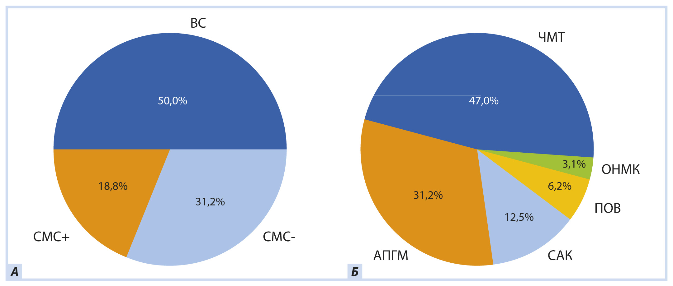 Рис. 4. Демографические данные участников исследования: А — распределение пациентов по уровню сознания, Б — распределение пациентов по этиологии. Примечание. ВС — вегетативное состояние, СМС+/СМС- — состояние минимального сознания плюс/минус, ОНМК — острое нарушение мозгового кровообращения, ПОВ — последствия оперативного вмешательства, АПГМ — аноксическое поражение головного мозга, САК — субарахноидальное кровоизлияние.