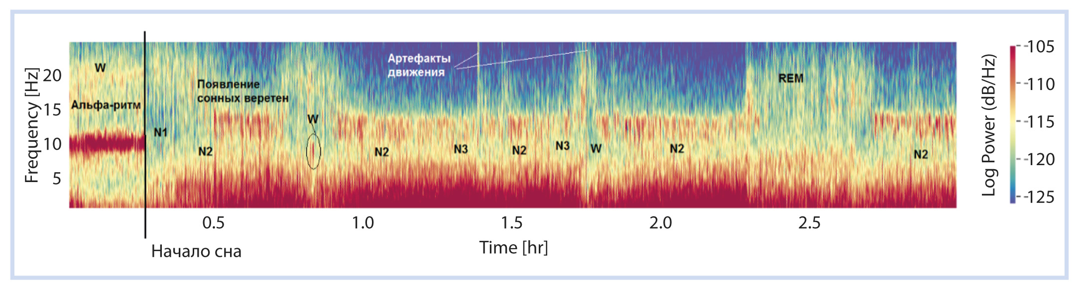 В трехфазном спектре можно различить не только смену сна и бодрствования, но и смену стадий N1–2 и N3–4 в виде нарастания медленноволновой активности при переходе от N1–2 к N3–4 (рис. 8).