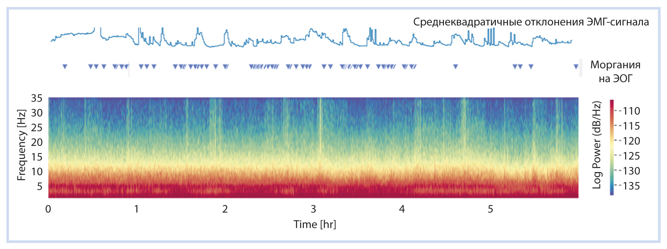 Монофазный спектр характеризуется отсутствием смены стадий на гипноспектрограмме: неизменная или незначительно меняющаяся СПМ на протяжении всего времени записи (рис. 6). В таком спектре выделить моменты несомненного бодрствования возможно только по наличию клинических признаков сна–бодрствования. За неимением видеорегистрации в качестве таковых нами были выделены артефакты моргания на кривой ЭОГ (синие метки сверху на рис. 6).