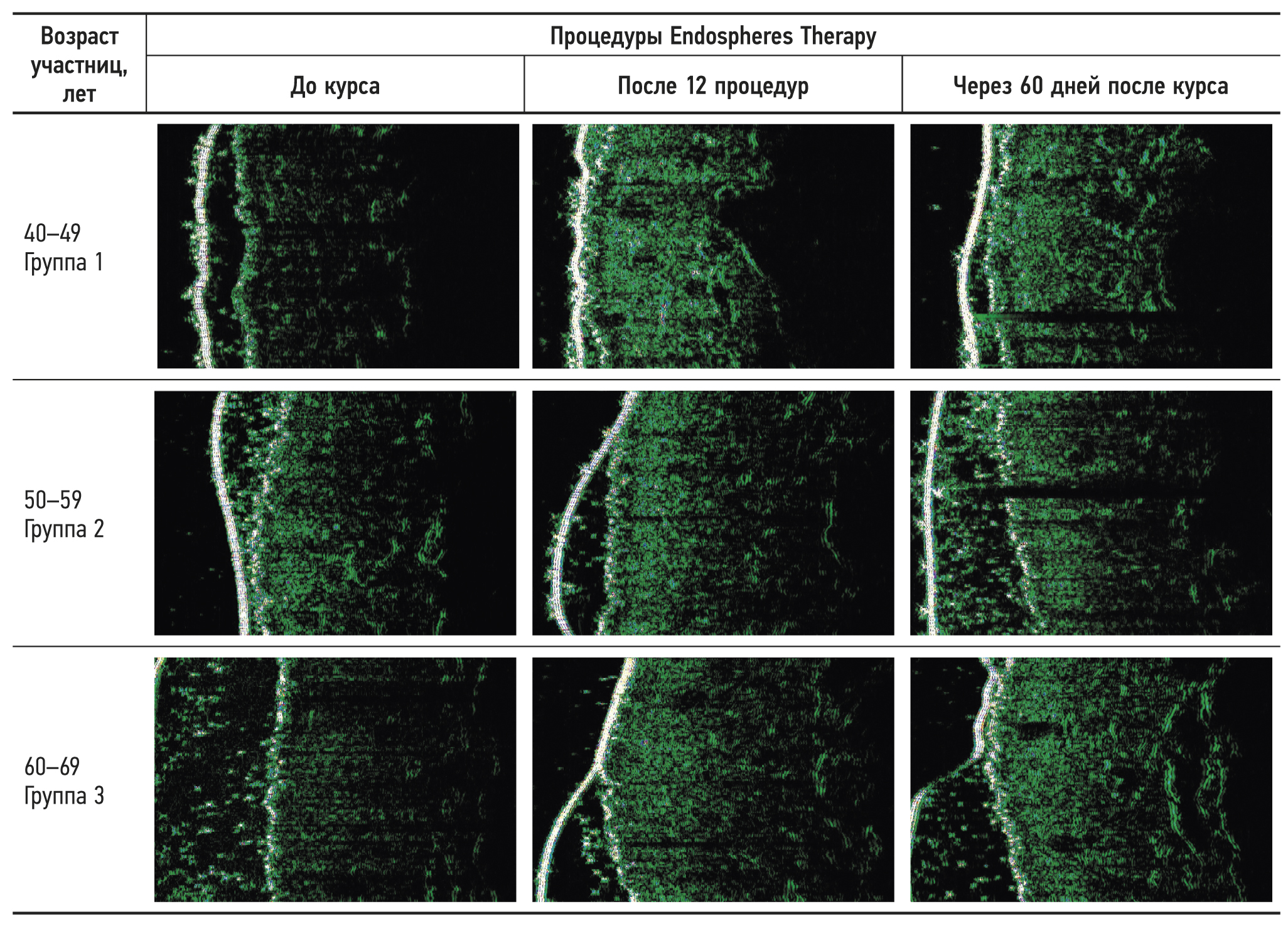 RESULTS: Changes in body mass index (BMI) revealed a trend toward weight loss in most of the participants. The circumference of the hips and waist in participants aged 40–49, 50–59 and 60–69 years decreased by 3.0±1.1 and 5.3±1.1, 2.2±0.9 and 4.1±1.3 and 2.5±0.9 and 6.3±1.5 cm, respectively. It was found that after the course of Endospheres Therapy in patients of the 1st, 2nd and 3rd age groups in the areas of the anterior, inner, posterior surface of the thigh and the anterior surface of the abdomen, the thickness of the dermis decreased by 15.6, 9.5 and 18.1%; 10.9, 10.5 and 19.3%; 6.1, 15.7 and 13.8%, 23.4, 14.7 and 14.5% (p <0.05), respectively; increased echogenicity of the dermis in the areas of the anterior, inner, posterior thigh and anterior abdominal surface by 2, 1.4 and 1.3; 1.2, 1.4 and 1.2; 1.4, 1.4 and 1.5; 1.3, 1.5 and 1.7 times (p <0.05), respectively. The echogenicity of the hypodermis decreased in the studied areas by 30.8, 27.6 and 31.2% (p <0.05); 20.1, 37.3 and 40.4% (p <0.05); 43.2, 57.8 (p <0.05) and 9.3%; 23.6, 15.2 (p <0.05) and 9.3%, respectively. The effect persisted 60 days after the course of therapy.