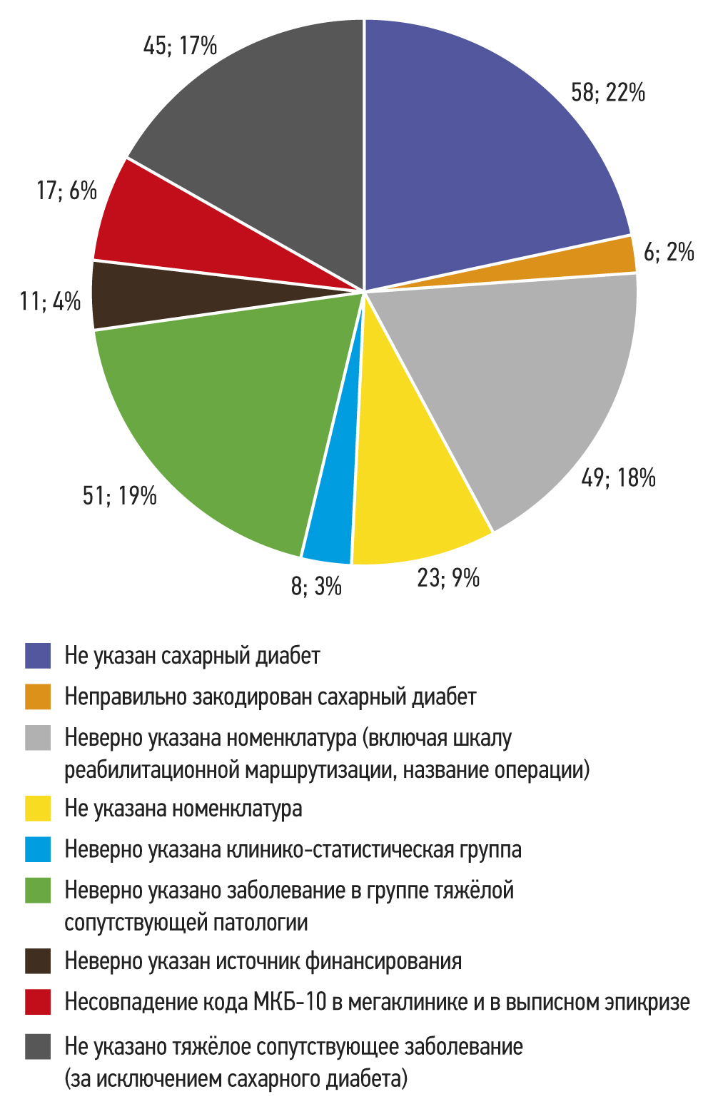К прочим замечаниям относились несовпадения в счёте в государственную информационную систему ОМС и медицинскую информационную систему данных по кодам МКБ-10, дополнительным коэффициентам (номенклатуре и пр.), а также неправильное использование номенклатуры медицинских услуг, что приводило к автоматическому расчёту непрофильного КСГ: например, при отсутствии номенклатуры услуг по медицинской реабилитации у пациента выставлялся неврологический КСГ по коду МКБ-10 основного заболевания, стоимость которого зачастую в 3–4 раза ниже реабилитационного КСГ (рис. 1).