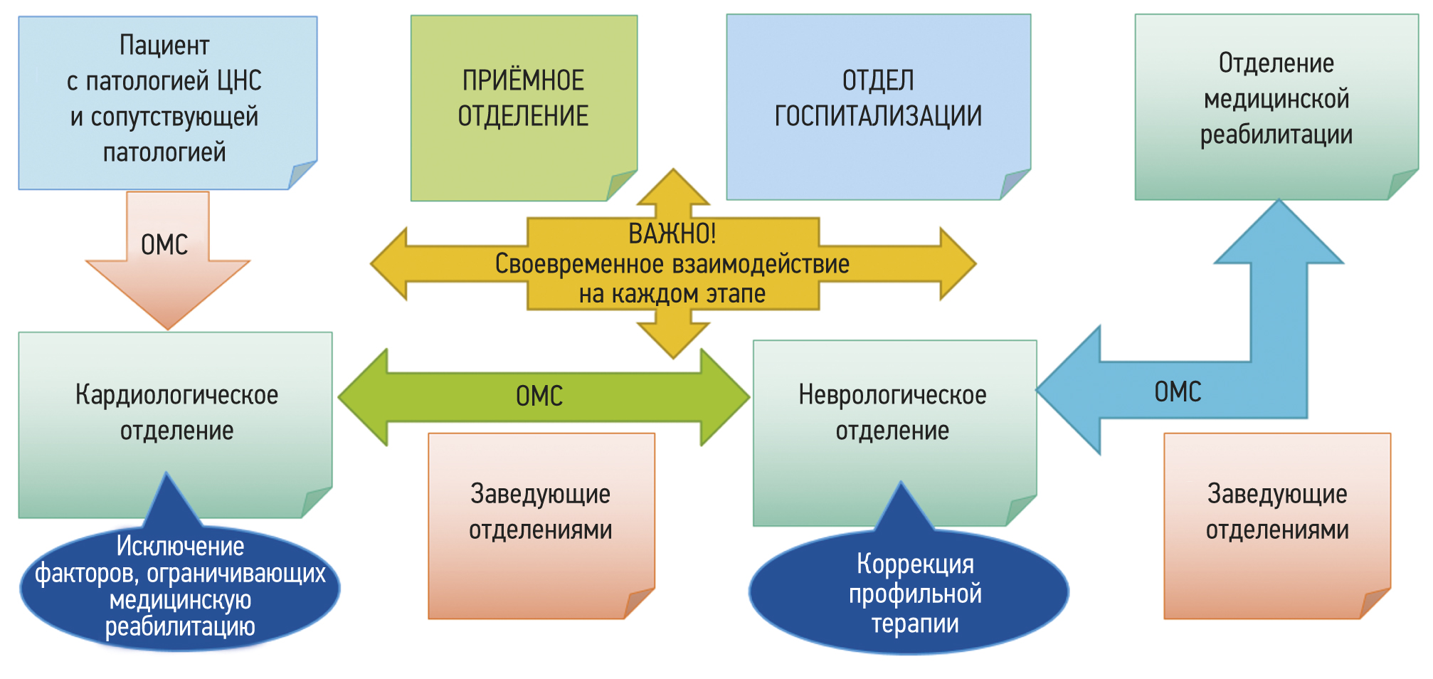 Fig. 3. Succession scheme in the provision of medical care to patients with concomitant pathology according to medical insurance. ОМС ― compulsory medical insurance; ЦНС ― central nervous system.