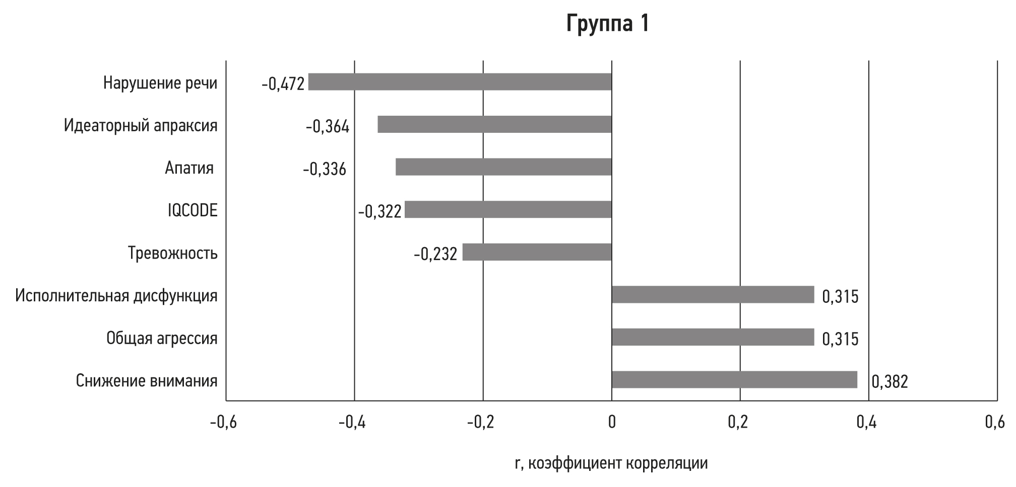 Корреляционный анализ RE с различными доменами нейропсихологического статуса пациентов группы 1 выявил отрицательную корреляцию с нарушениями речи (r=-0,472; p <0,001), идеаторной апраксией (r=-0,364; p=0,006), уровнем апатии (r=-0,336; p <0,001) и степенью IQCODE (r=-0,322; p <0,001). Положительные взаимоотношения были продемонстрированы с показателями исполнительной дисфункции (r=0,315; p=0,003), снижением внимания (r=0,382; p <0,001) и уровнем общей агрессии (r=0,315; p <0,001) (рис. 1).