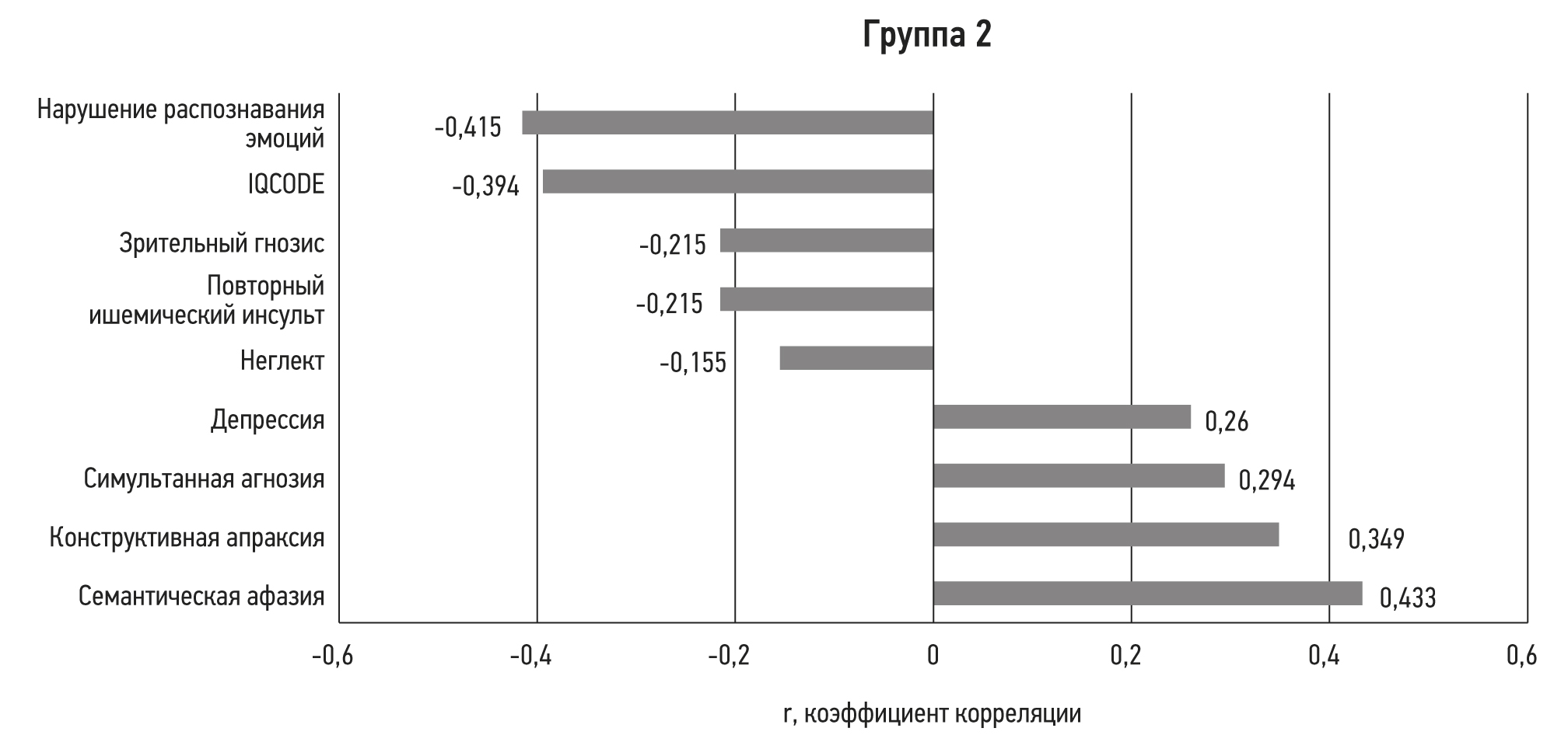 У пациентов группы 2 отрицательная корреляция RE отмечена с нарушением распознавания эмоций (r=-0,415; p <0,001), зрительной агнозией (r=-0,215; p=0,001), наличием повторного инсульта в анамнезе (r=-0,215; p <0,001) и степенью IQCODE (r=-0,394; p <0,001). Положительная корреляция была выявлена с параметрами симультанного гнозиса (r=0,294; p <0,001), семантической обработки информации (r=0,433; p=0,02), конструктивного праксиса (r=0,349; p <0,001) и уровнем депрессии (r=0,260; p=0,007) (рис. 2).