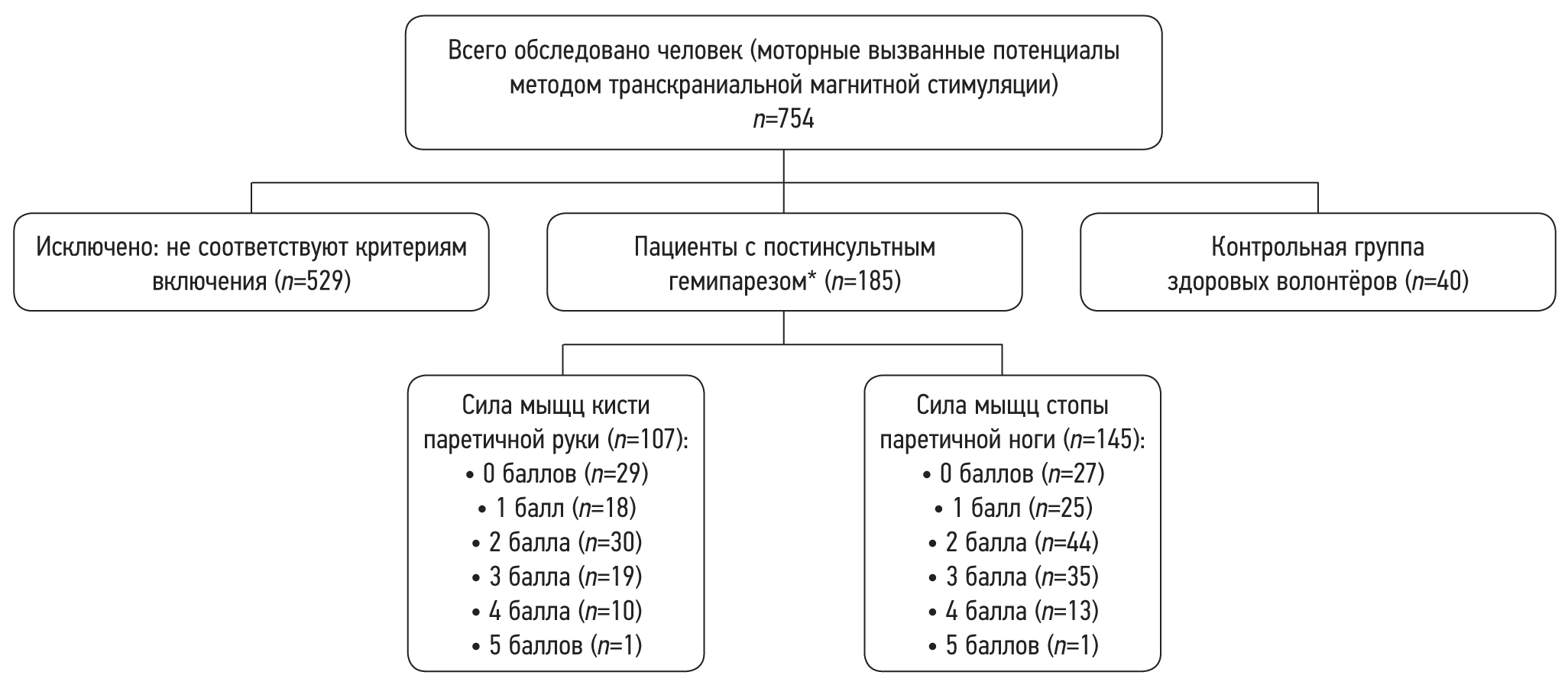 В ретроспективное обсервационное исследование по данным регистра лаборатории нейрофизиологии нейрореабилитационного центра на основании 754 обработанных обезличенных информационных карт пациентов и здоровых добровольцев, проходивших исследование моторных вызванных потенциалов методом транскраниальной магнитной стимуляции, отобрано 185 человек в возрасте от 19 до 88 лет с верифицированным постинсультным гемипарезом (мужчин ― 56,2%, женщин ― 43,8%) и 40 здоровых волонтёров в возрасте от 20 до 85 лет (мужчин ― 55,0%, женщин ― 45,0%). Схема исследования представлена на рис. 1.