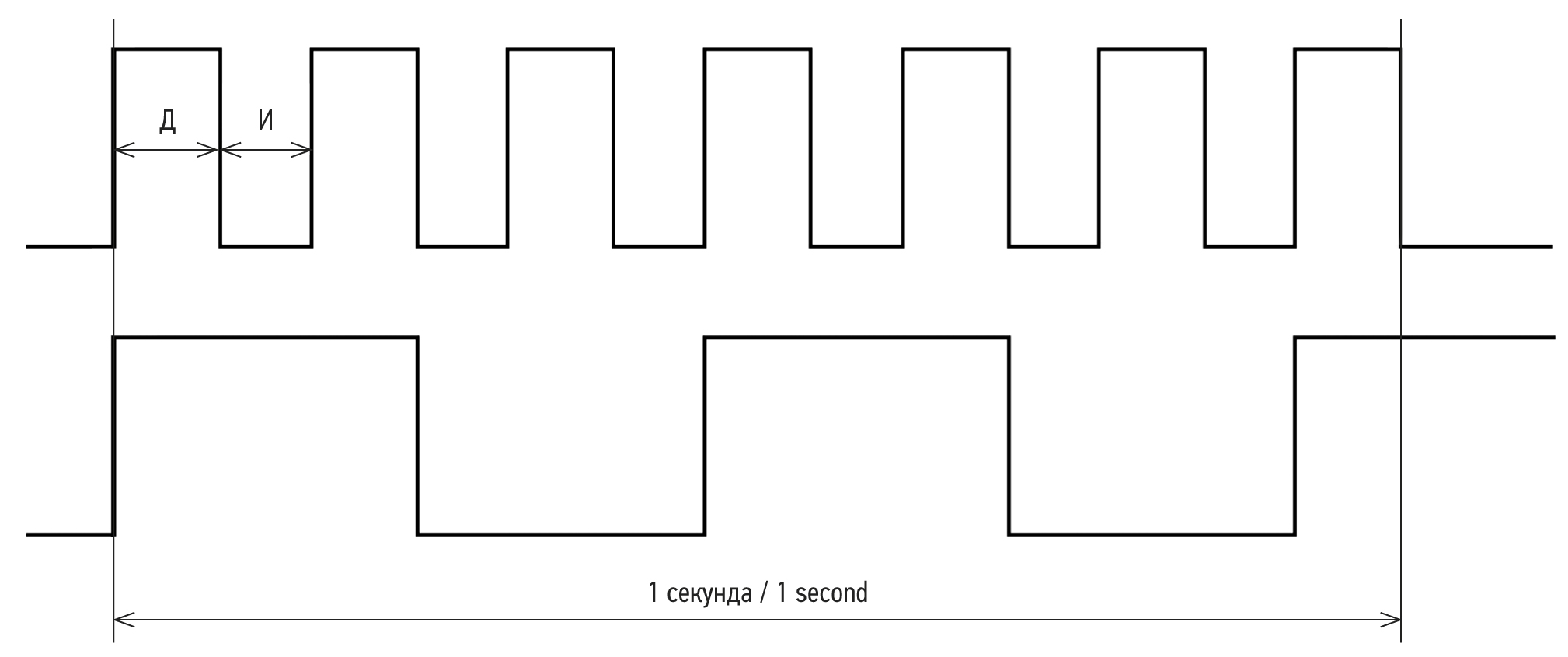Рис. 1. Однополярный меандр. Вверху ― последовательность импульсов на частоте 7 Гц, внизу ― 2,3 Гц. Буквой «Д» обозначена длительность импульса, буквой «И» ― интервал.